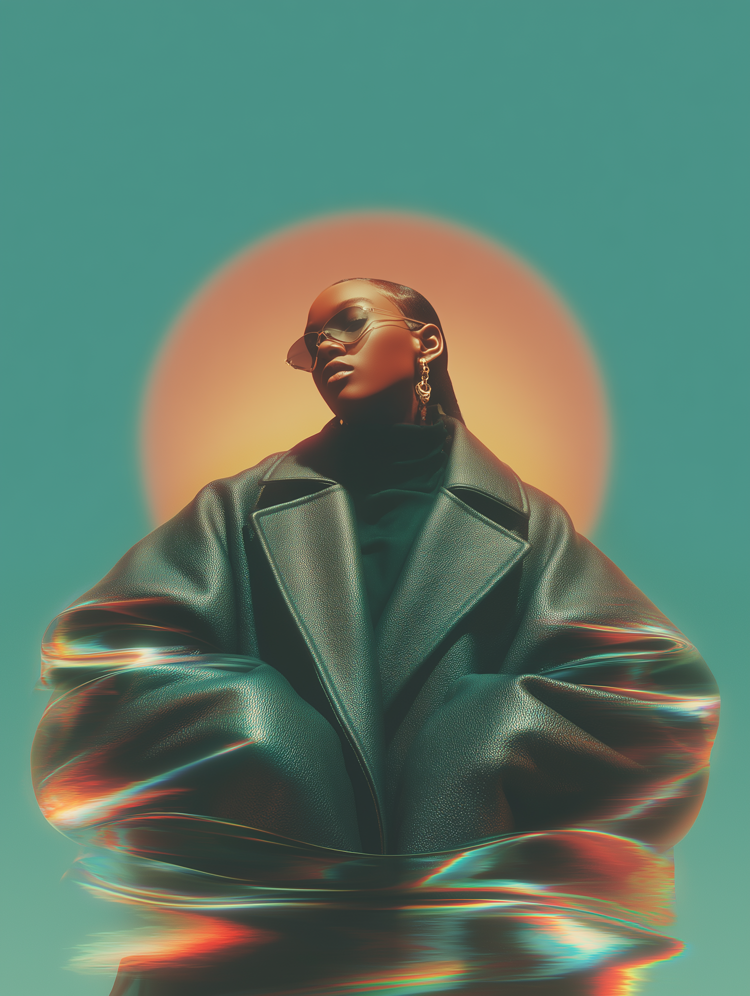 Stylized portrait of a person in a leather jacket with sunglasses, glowing halo, and dynamic light effects on a teal background.
