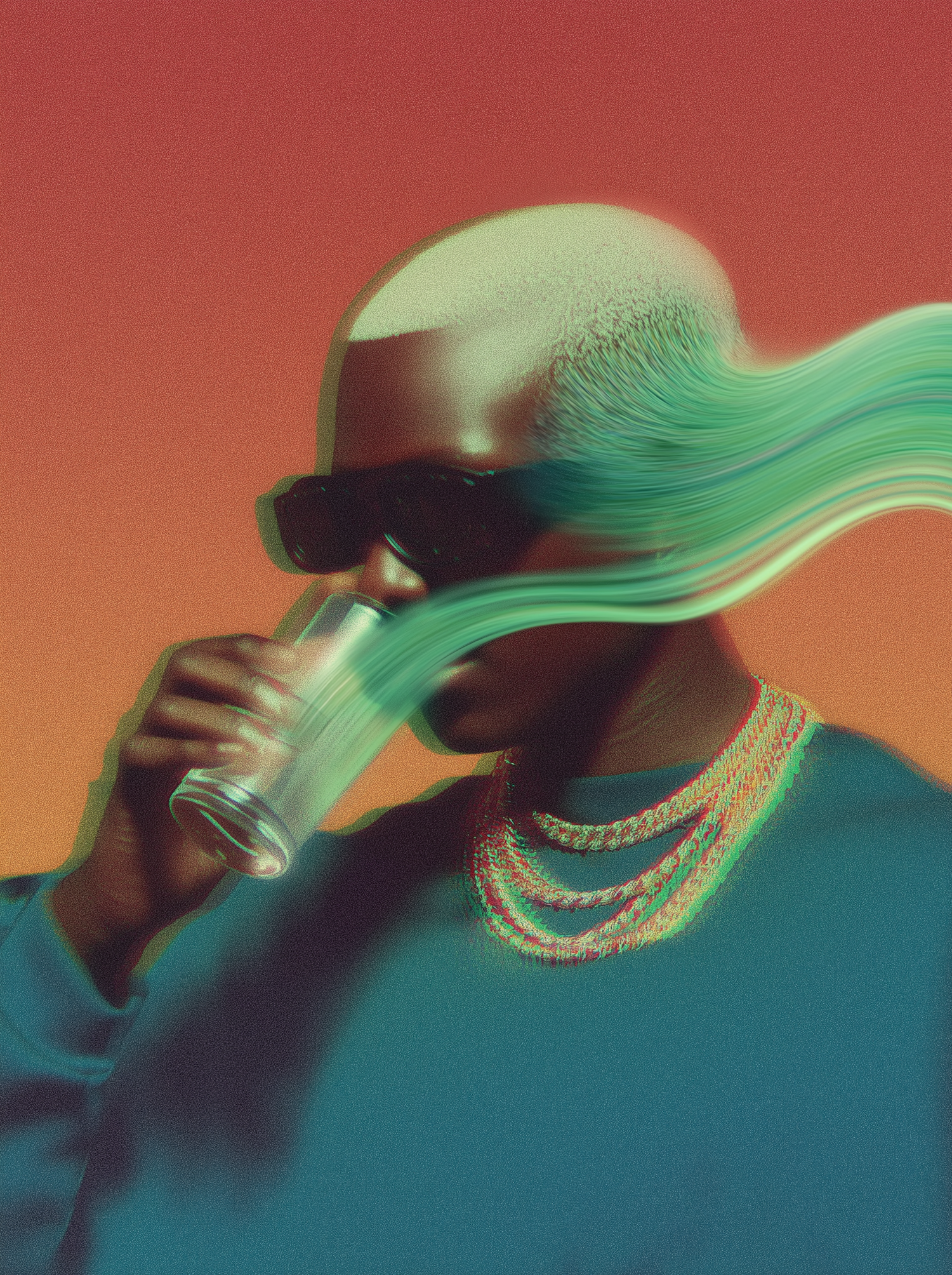 Stylized portrait of a person with sunglasses and layered necklaces, drinking from a glass, with vibrant colors and artistic effects.