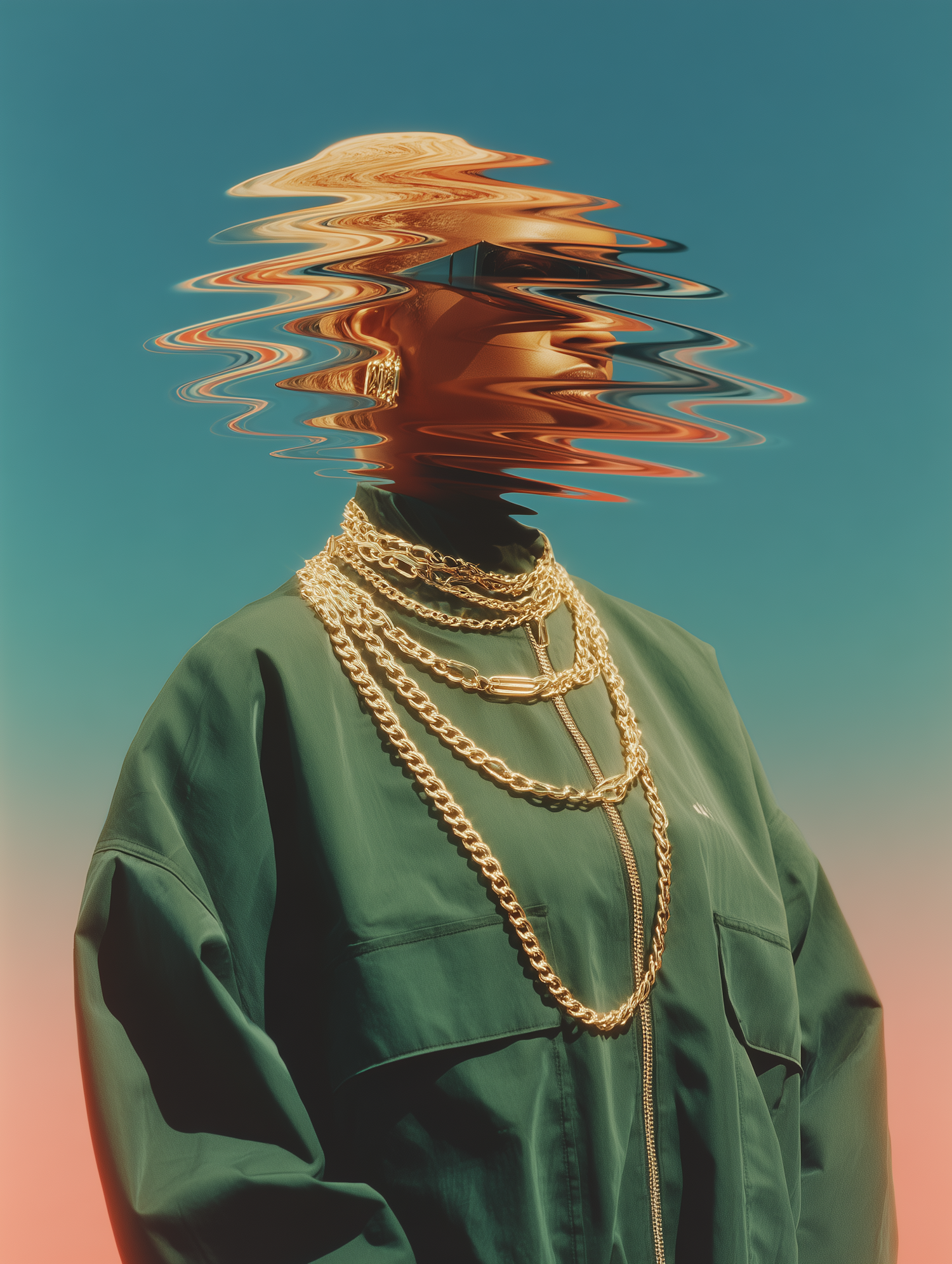 Stylized portrait of a person in a green jacket with gold chains, featuring a surreal wavy distortion effect and a gradient background.