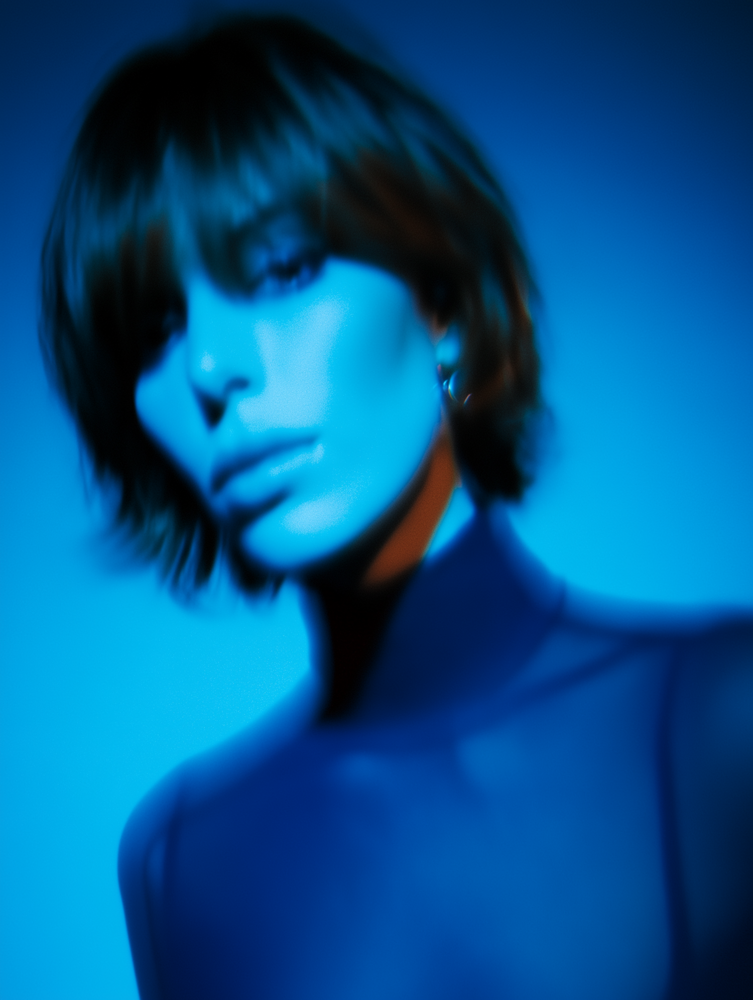 Stylized portrait with blue lighting and soft focus, featuring a person with short hair and a high-necked outfit in an artistic composition.