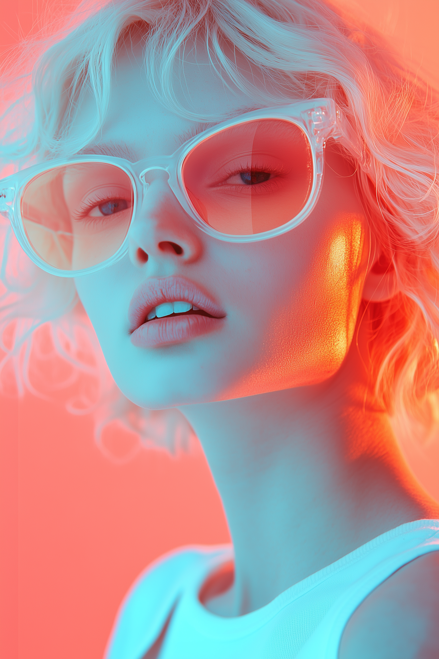 Stylized close-up of a woman with blonde hair, pink-tinted sunglasses, and vibrant blue-orange lighting for a modern, artistic vibe.