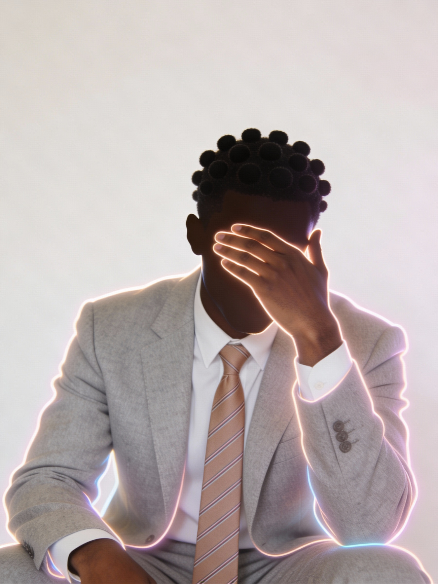A clean, soft-toned portrait of a man in a light grey wool suit, white shirt, and a muted taupe tie with subtle patterning. His bantu knots are evenly spaced and matte-finished, adding quiet texture. He gently covers his eyes with one hand, creating a contemplative silhouette. The background is pale ivory, with diffused lighting and ample negative space, evoking calm and clarity.