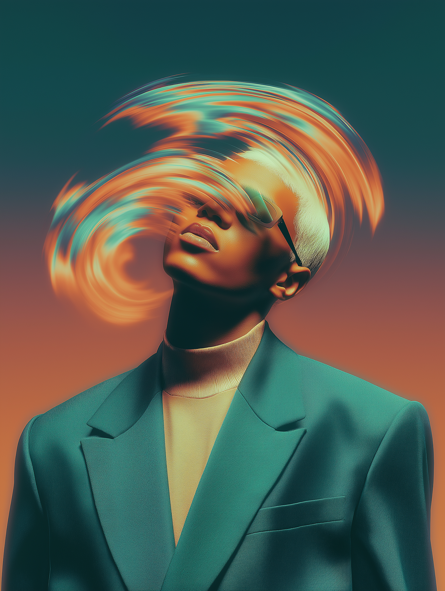 Stylized portrait of a person in a teal blazer with dynamic light trails and a gradient background, creating a vibrant and modern aesthetic.