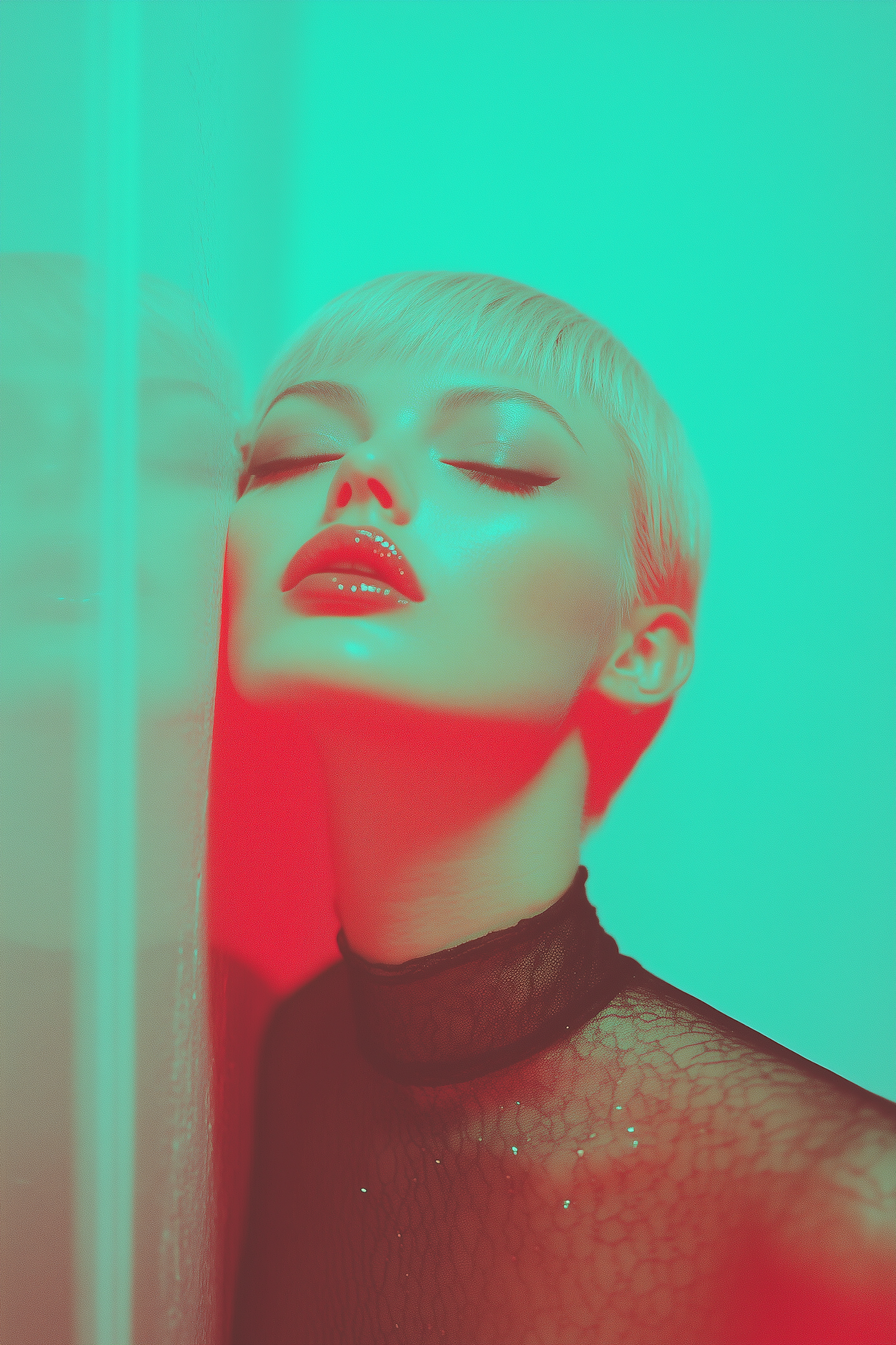 Stylized close-up of a person with platinum blonde hair, vibrant red and teal lighting, glossy red lips, and a black lace top.