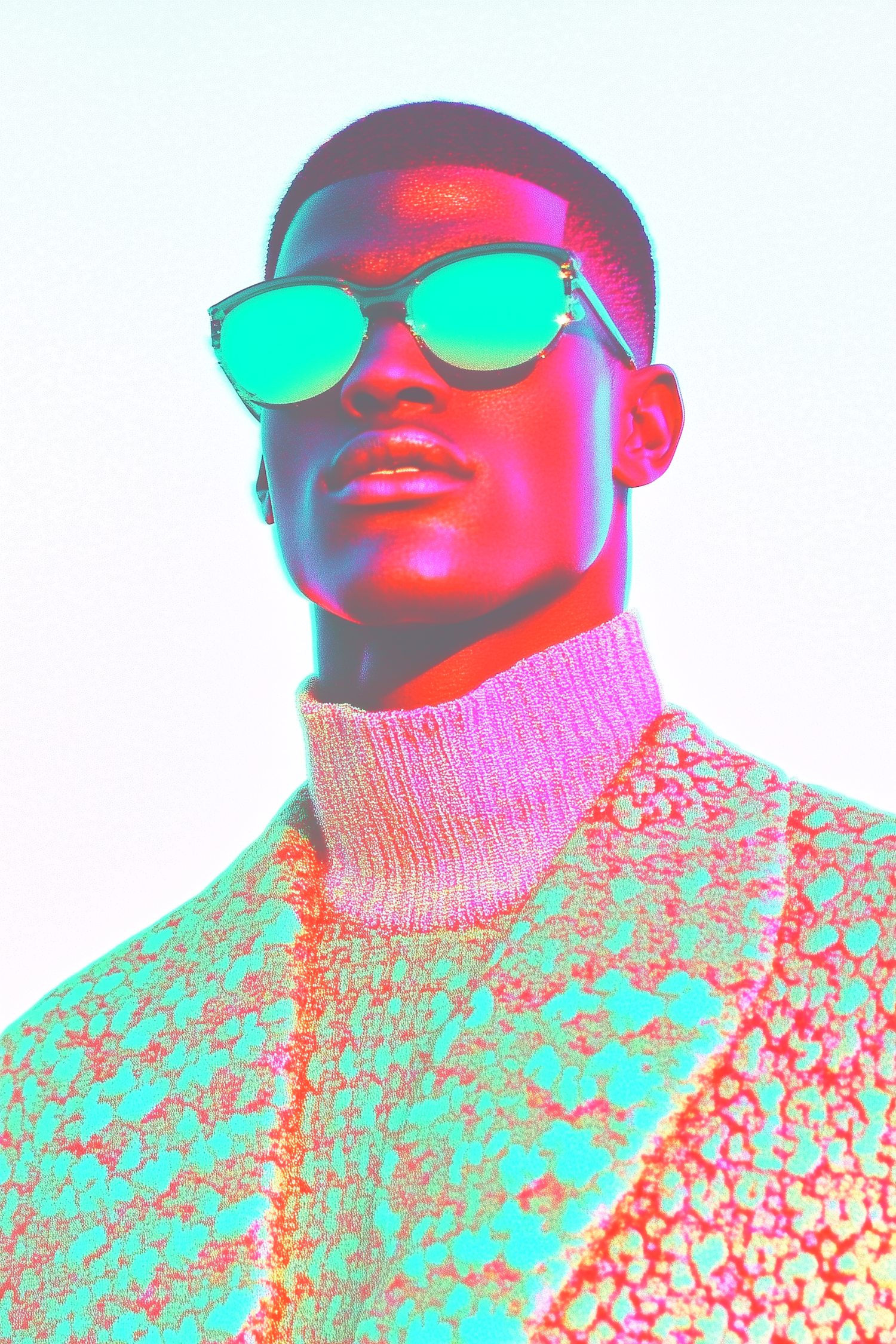 Futuristic portrait of a man in neon colors, wearing reflective sunglasses and a textured sweater. Vibrant pink and green hues dominate.