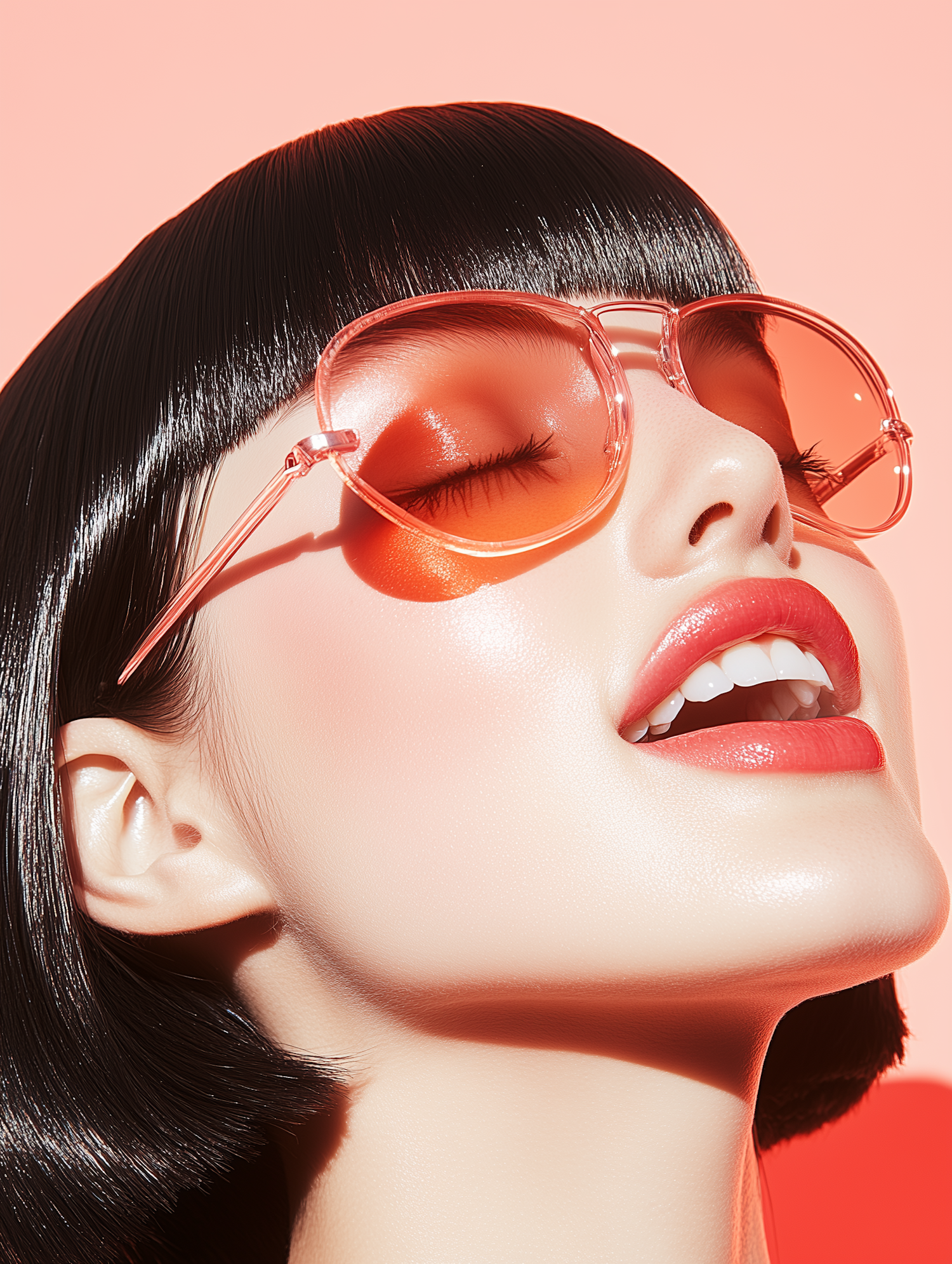 Close-up of a woman with pink sunglasses, black bob haircut, and glossy red lips against a peach background.