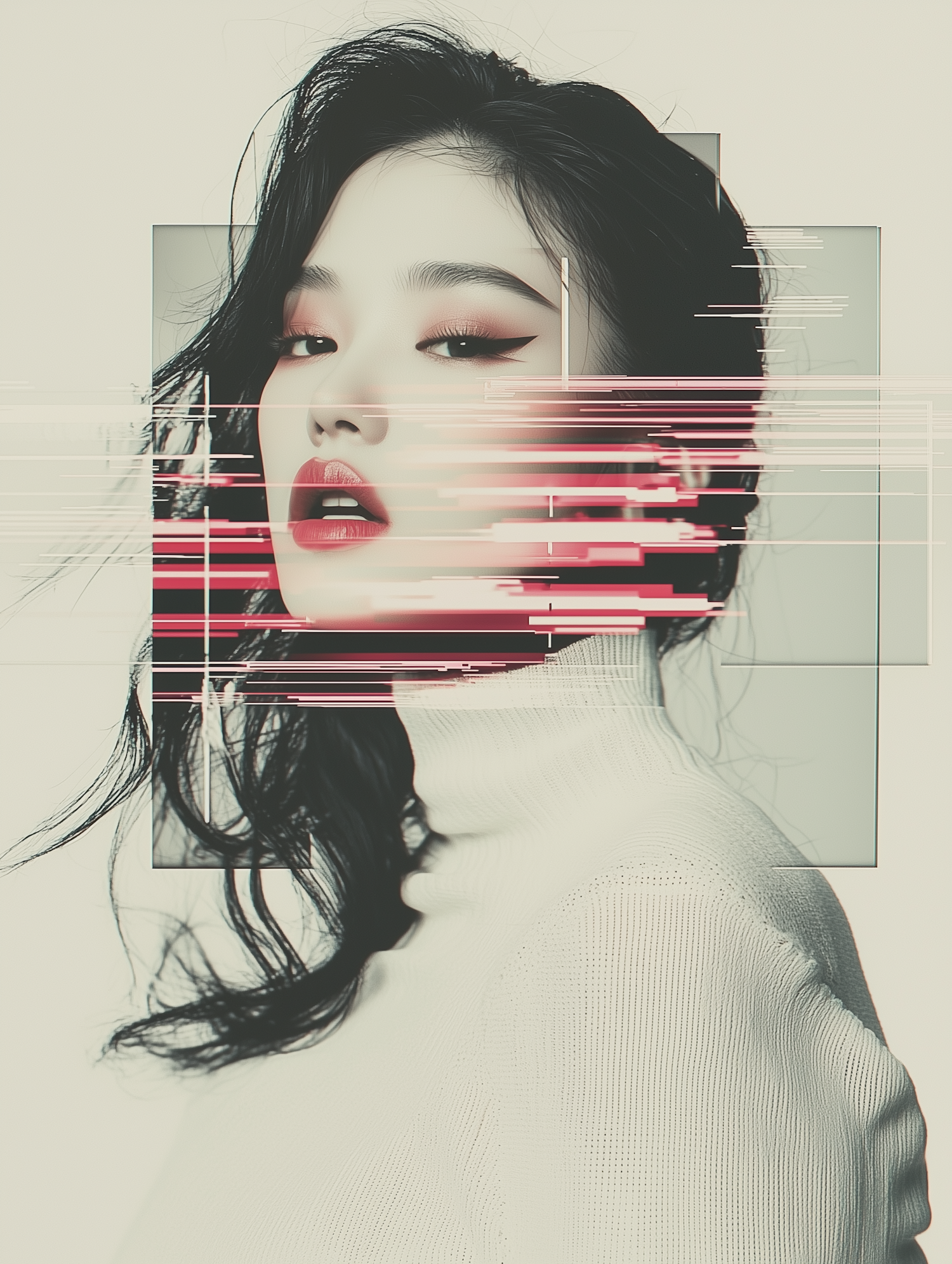 Stylized portrait of an Asian woman with glitch art overlays, bold makeup, and a white turtleneck, creating a modern, artistic vibe.
