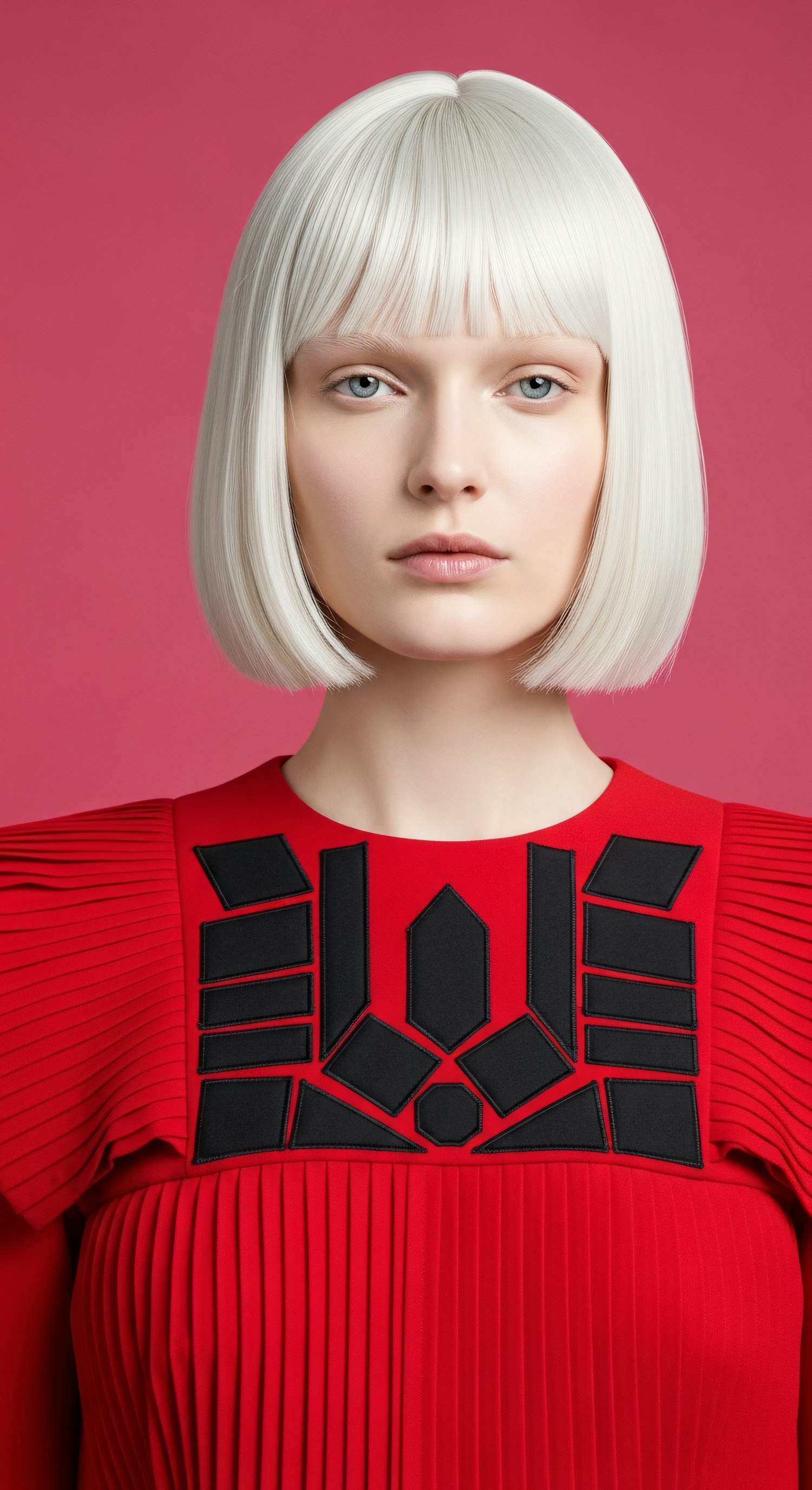 A striking portrait of a person with blond hair, styled bob, wearing a red outfit with black patterns, against a clean pink backdrop.