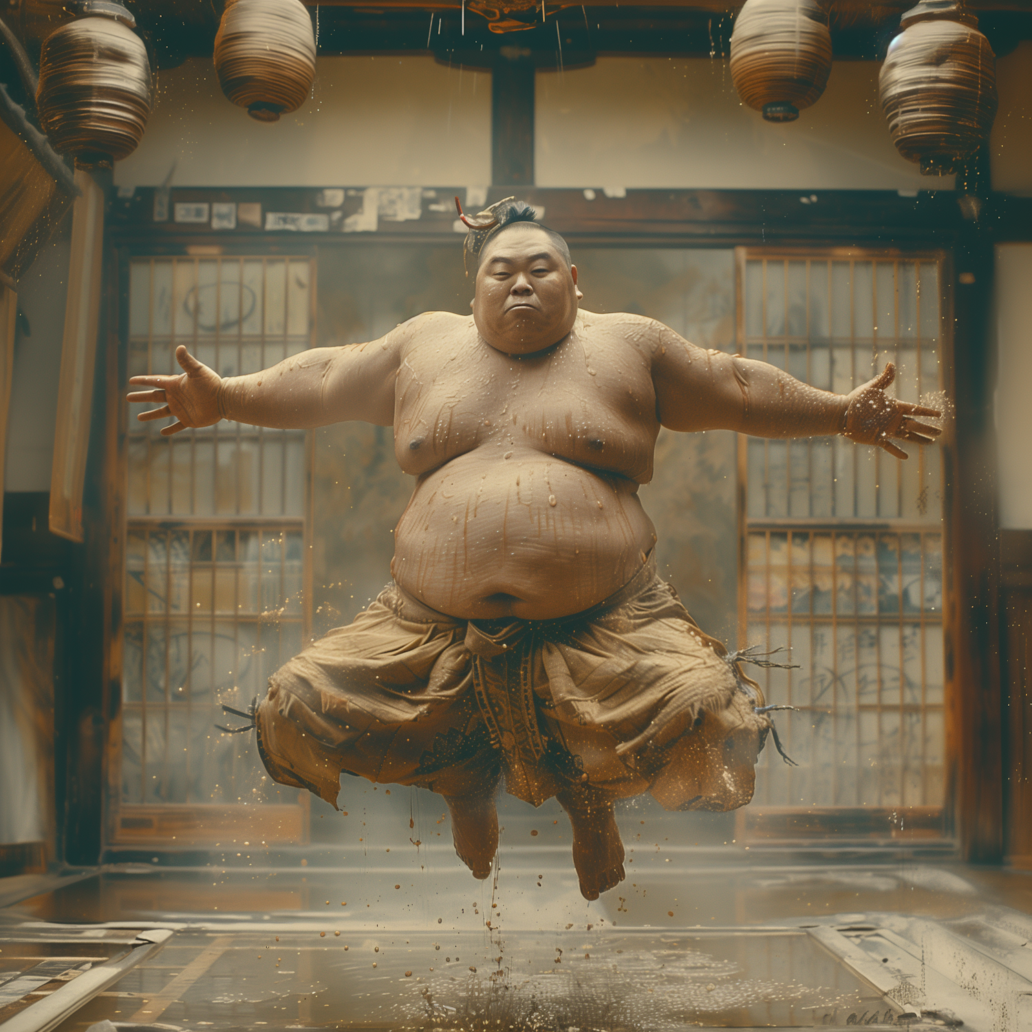 Dynamic image of a sumo wrestler mid-jump in a traditional Japanese setting, showcasing energy and cultural authenticity.