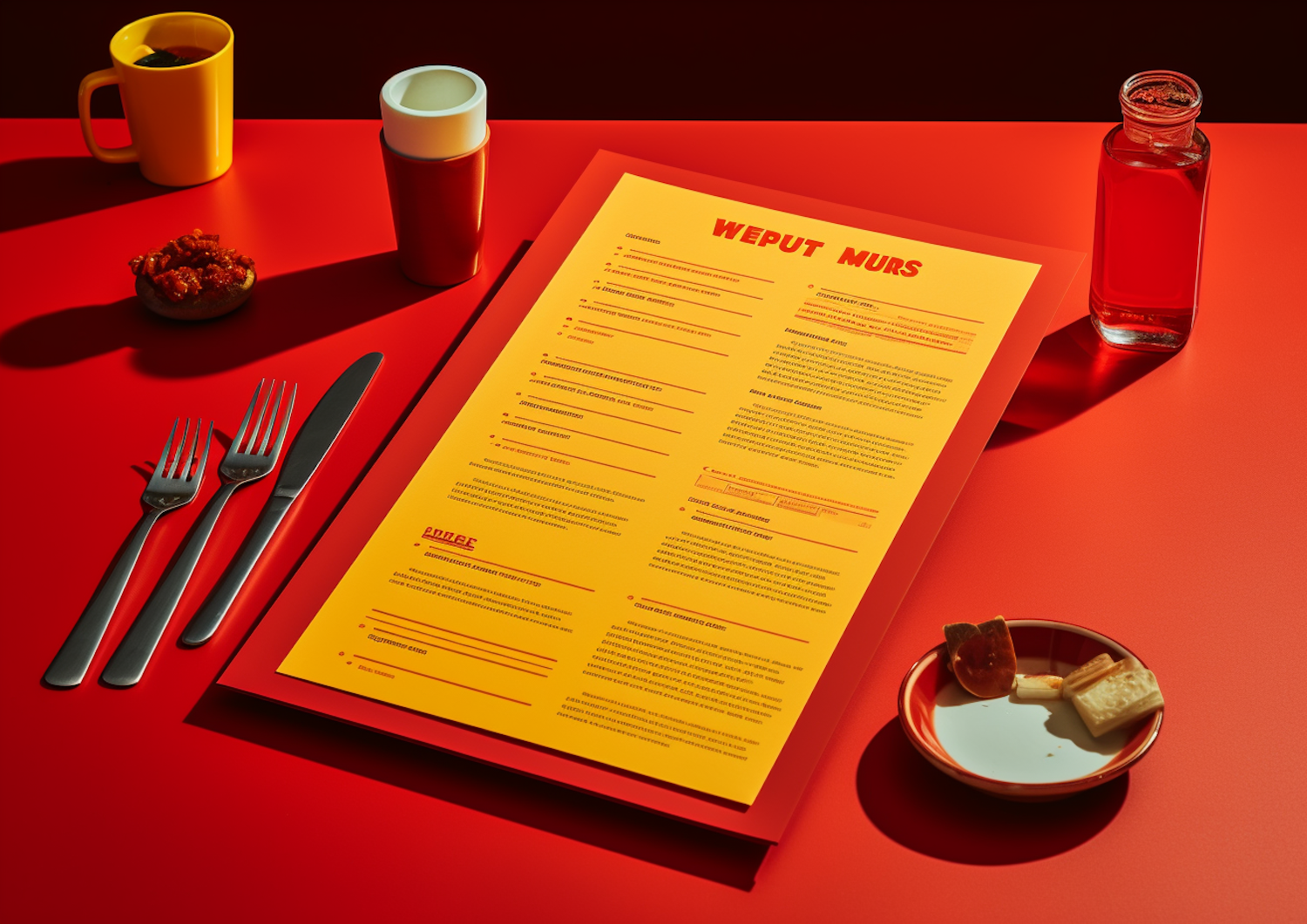 Bold red and yellow table setting with a menu, drinks, and snacks, creating a vibrant dining atmosphere.