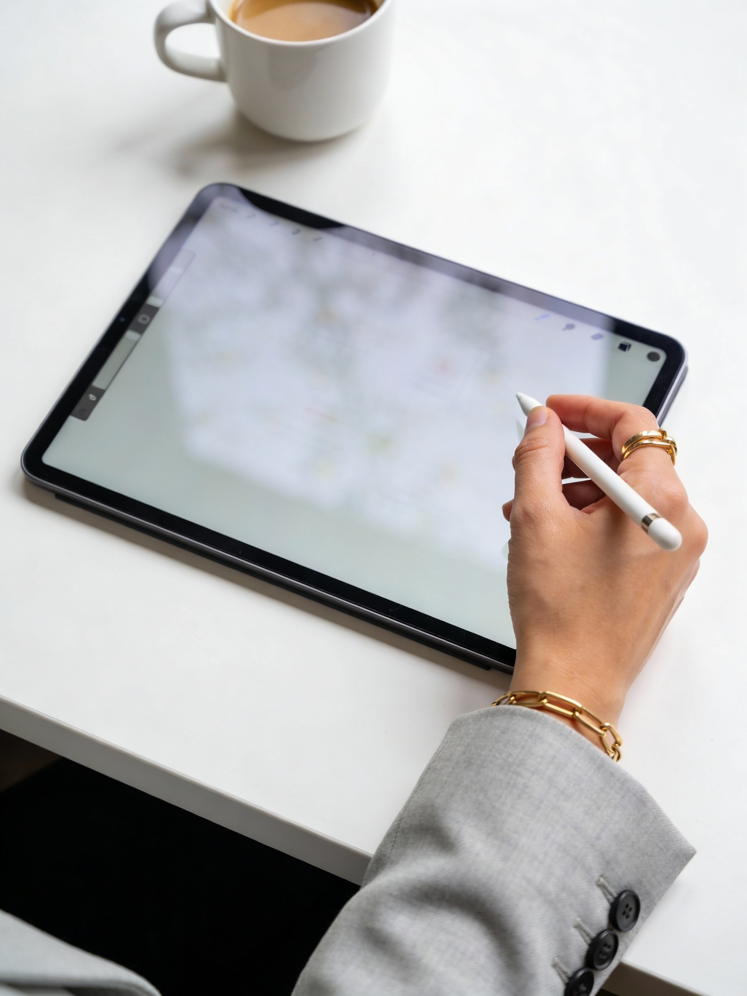 Soft natural daylight, neutral color palette, shallow depth of field, minimal grain, high-resolution lifestyle photo. Overhead shot of a tablet lying flat on a white table, screen mostly light and softly overexposed so no details can be read, with a stylus resting near the edge. A hand with gold jewelry in a light grey blazer sleeve lightly holds the stylus. A white cup of coffee appears near the top of the frame. No face. Clean modern workspace styling, no clutter, no text, no logos, no identifiable brand marks.