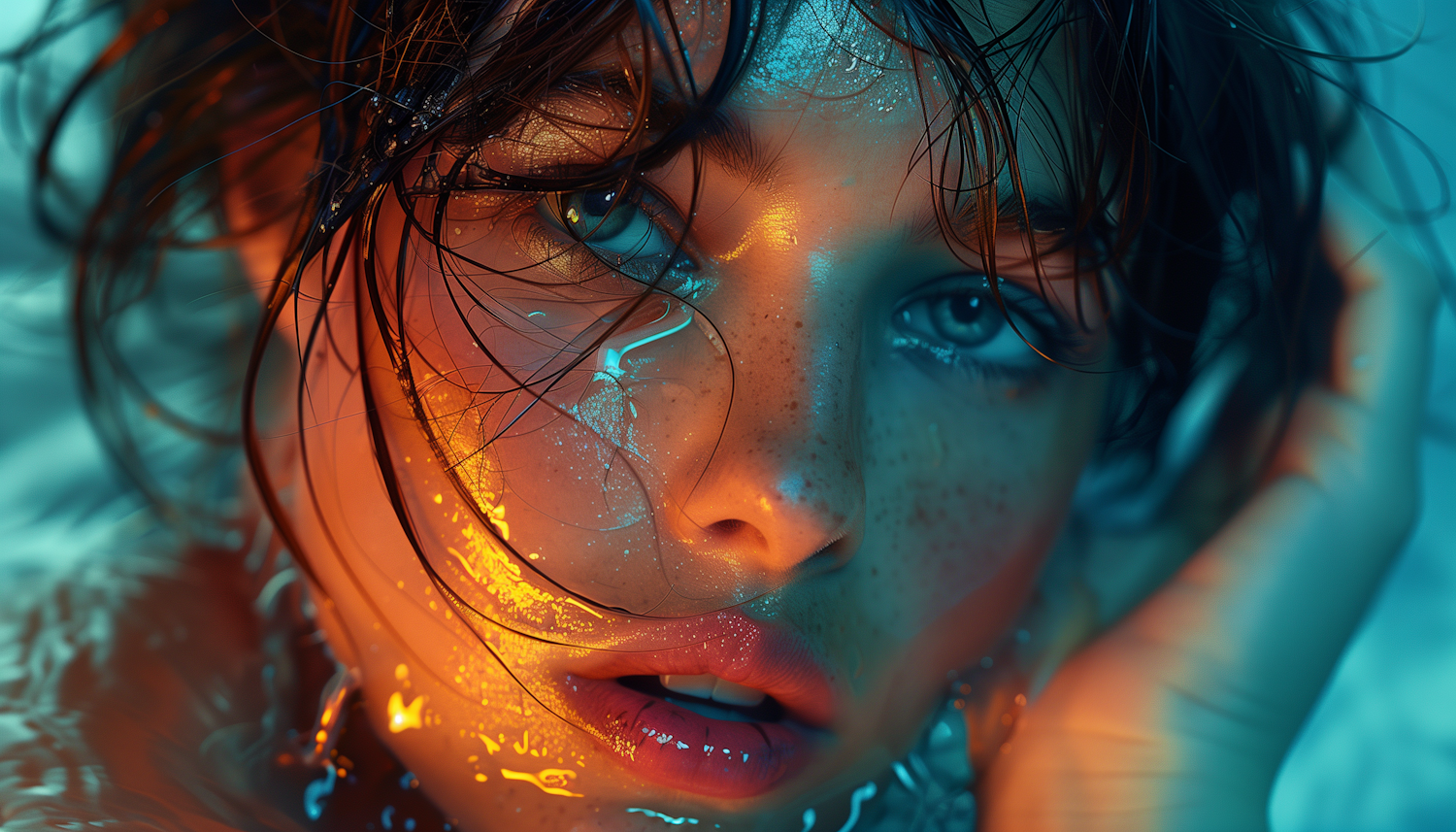 Close-up of a freckled woman with wet hair, illuminated by vibrant orange and blue lighting, creating a dramatic and captivating effect.