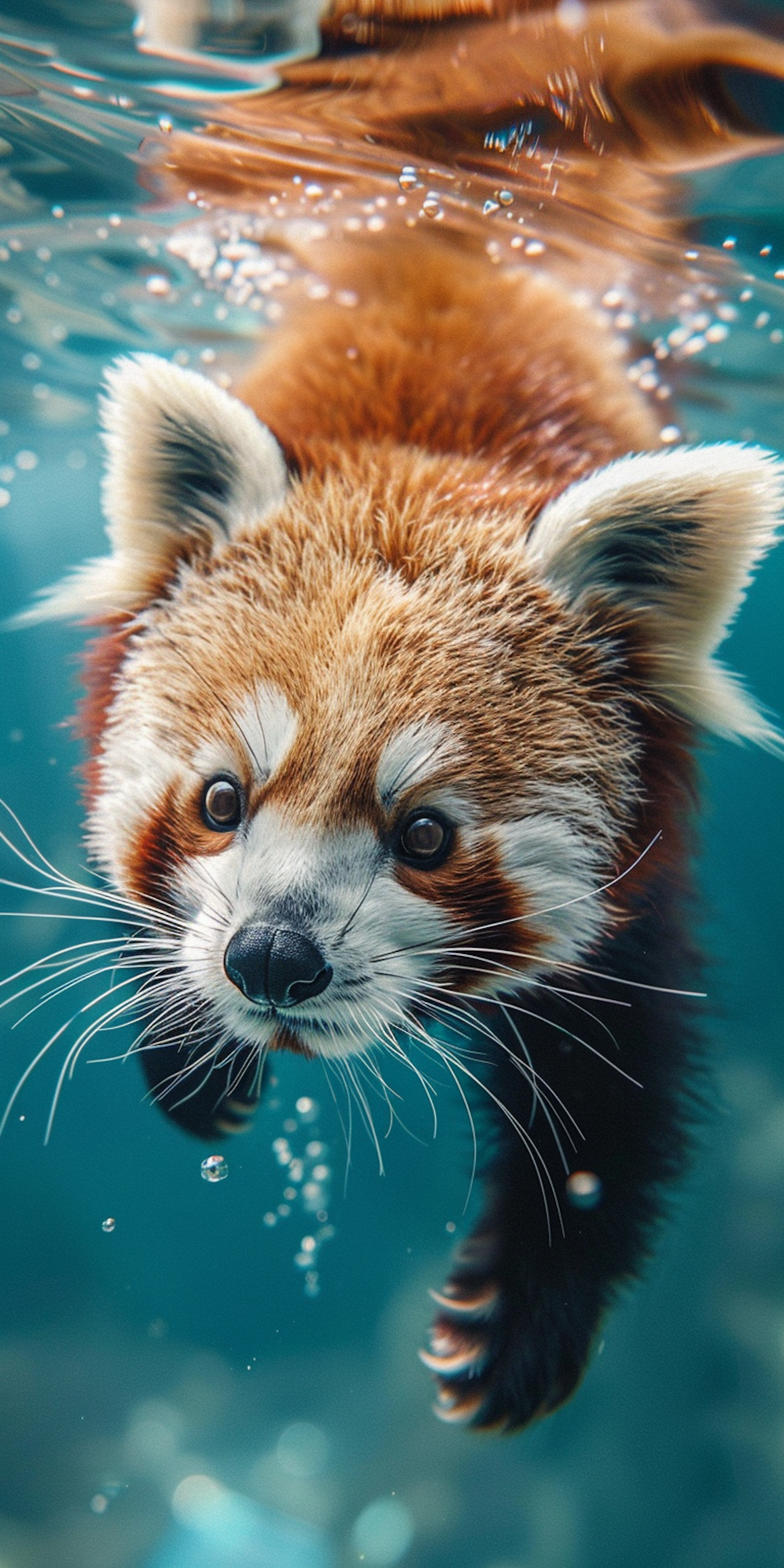 A red panda swimming underwater, surrounded by bubbles, with vibrant fur and expressive eyes in clear blue water.
