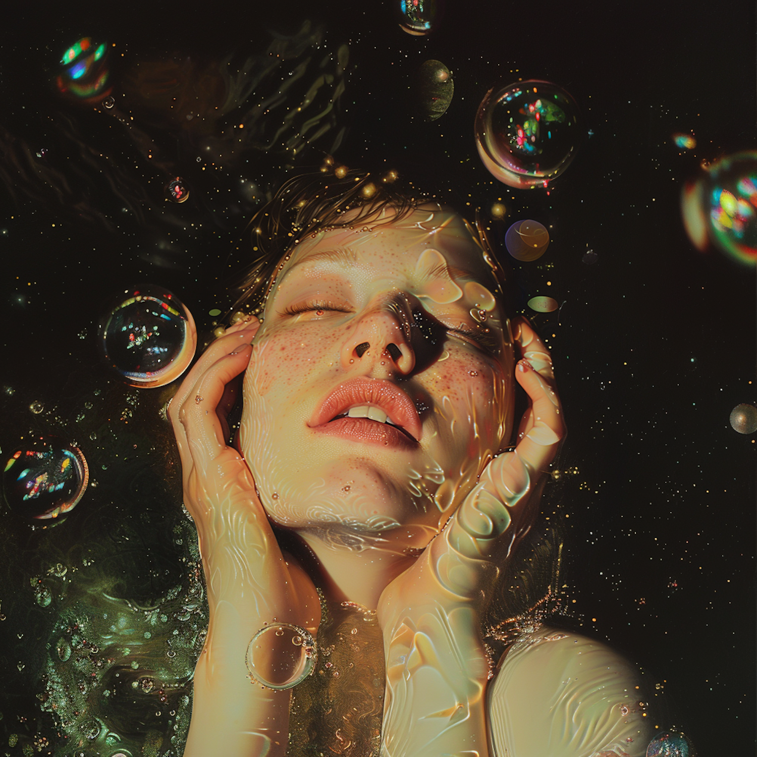 A serene woman submerged in water, surrounded by colorful bubbles, creating a dreamlike and ethereal atmosphere.