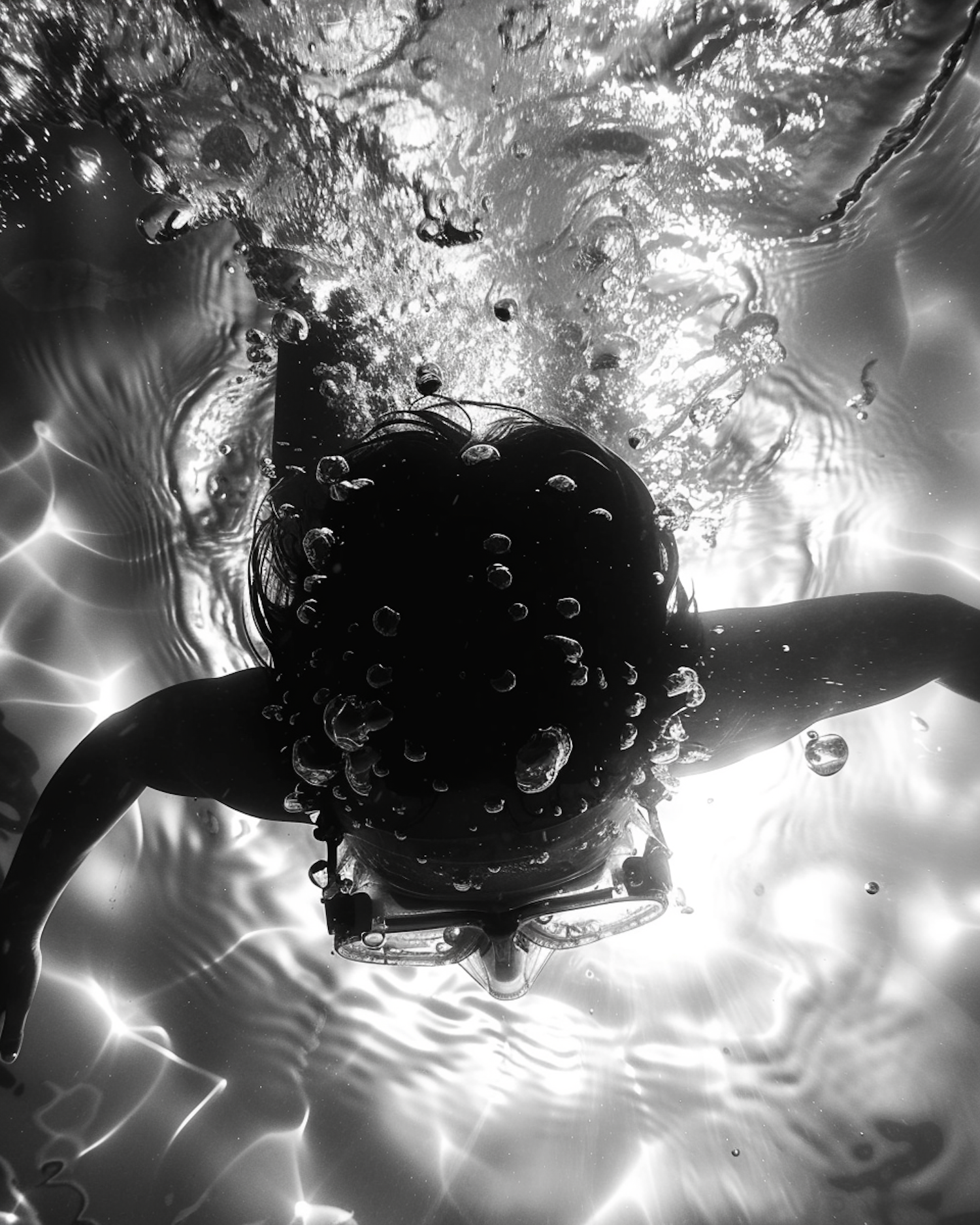 Black and white underwater photo of a swimmer with goggles, surrounded by bubbles and light patterns.