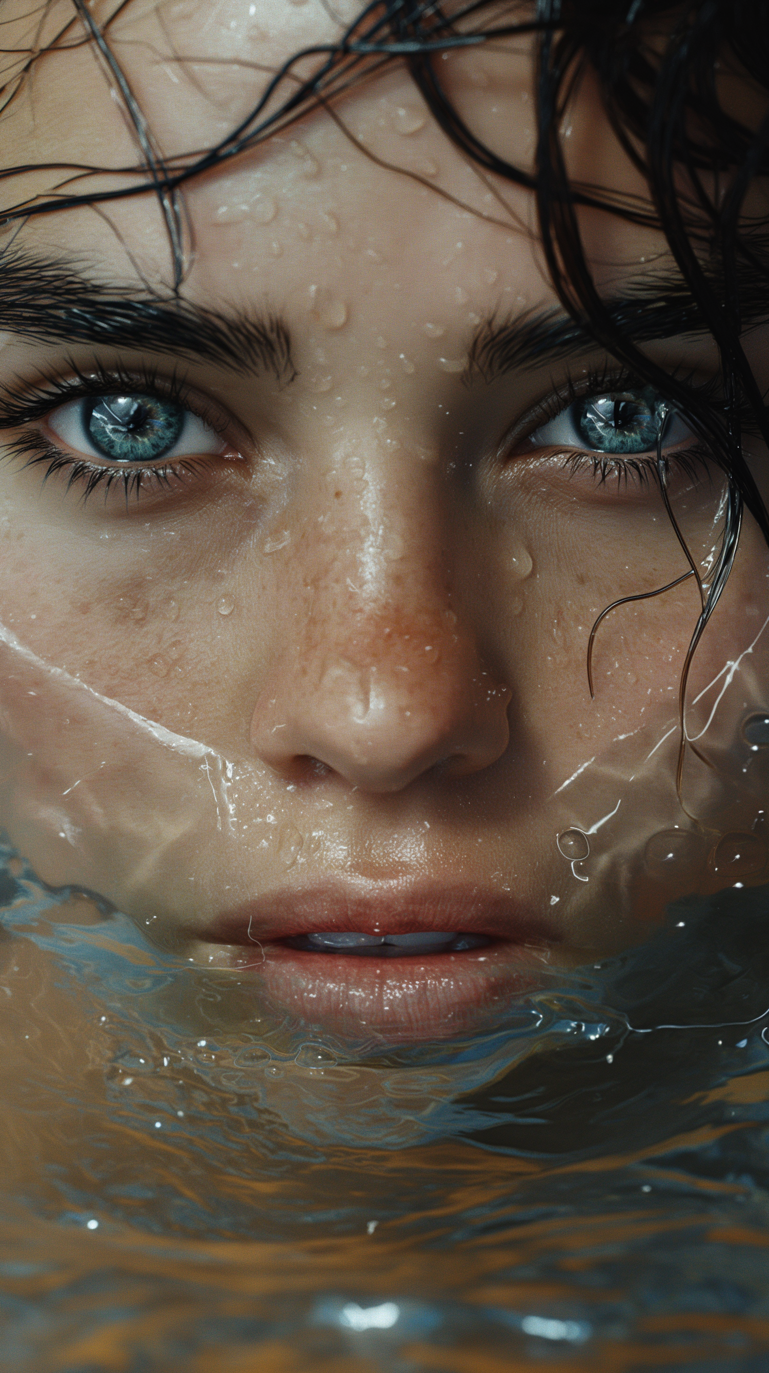Close-up of a face with blue eyes and wet hair, partially submerged in water, highlighting skin texture and water droplets.