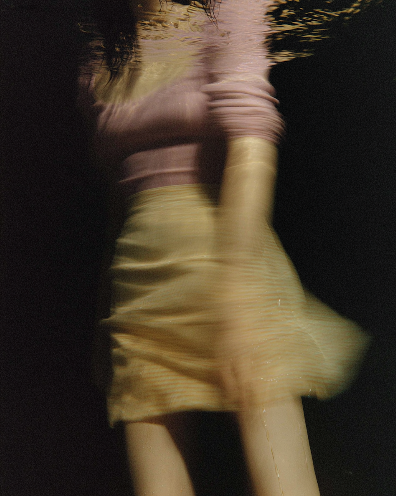 Abstract image of a person submerged in water, with distorted reflections and dynamic lighting creating a surreal effect.