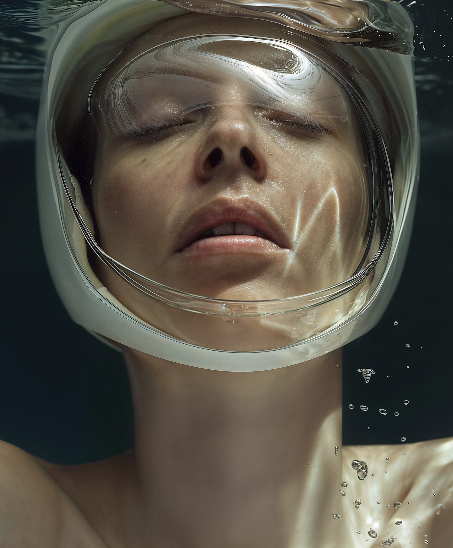 Close-up of a person underwater with a transparent helmet, serene expression, and light reflections creating an ethereal effect.
