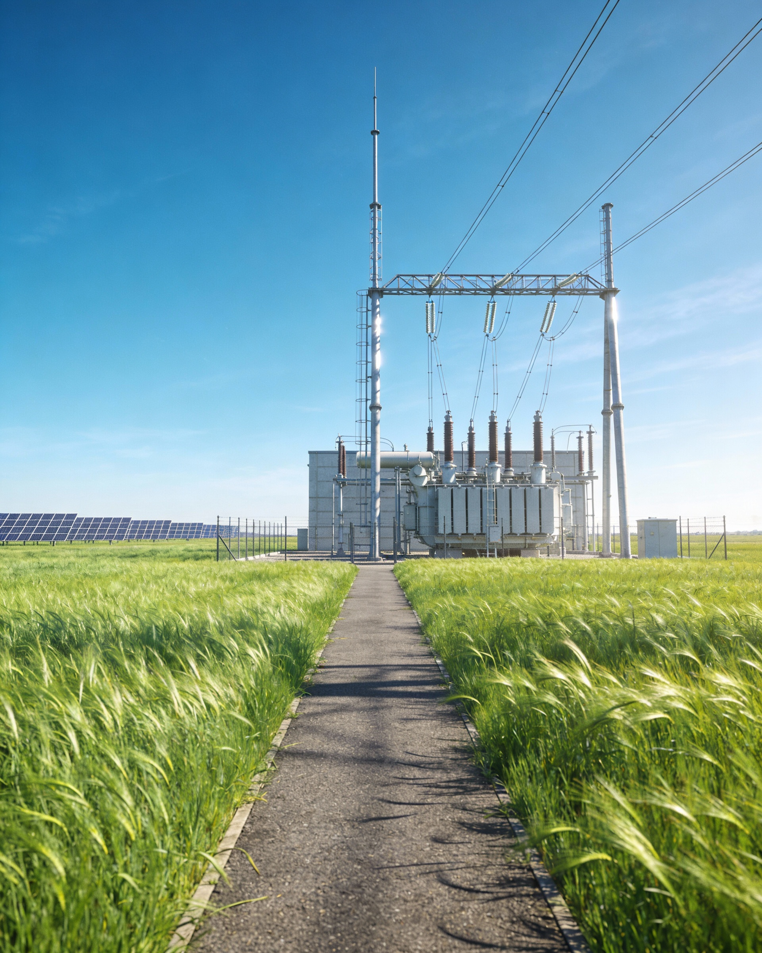 A power substation in a green field with solar panels in the background, under a clear blue sky, showcasing renewable energy infrastructure.