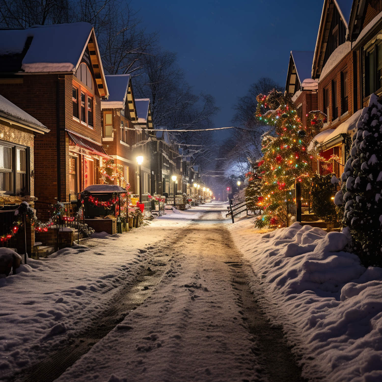 Charming snow-covered street with festive Christmas lights and decorations on brick houses, creating a cozy winter atmosphere.