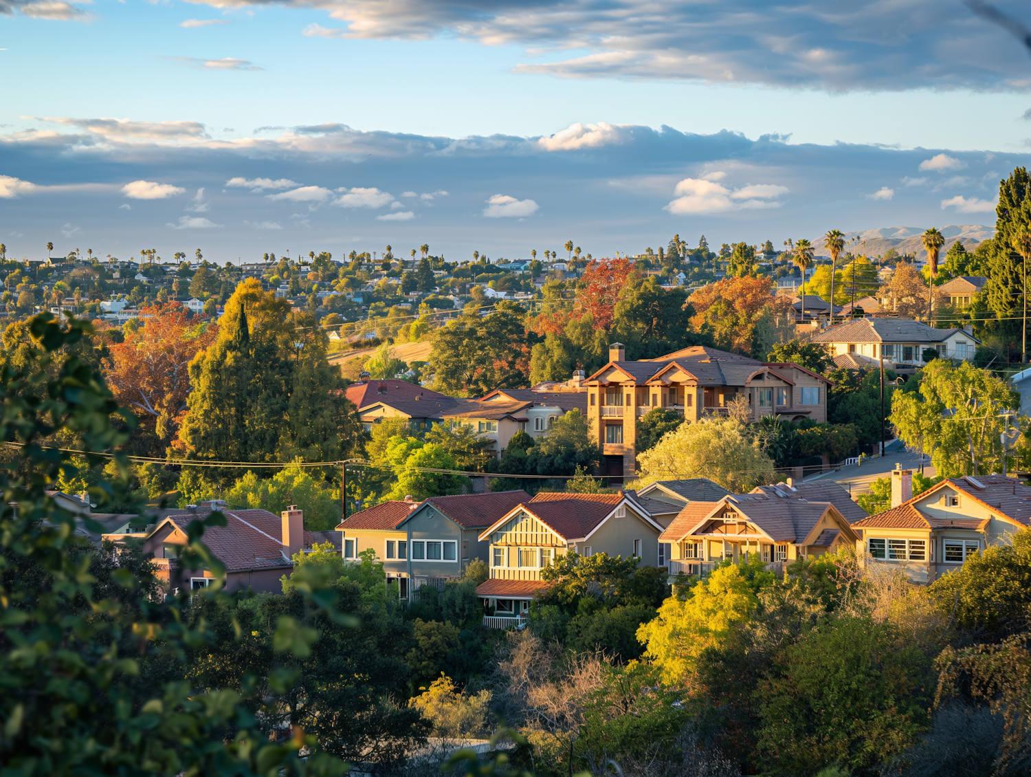 Charming suburban neighborhood with diverse architecture, lush greenery, and a serene sky, creating a peaceful and inviting atmosphere.