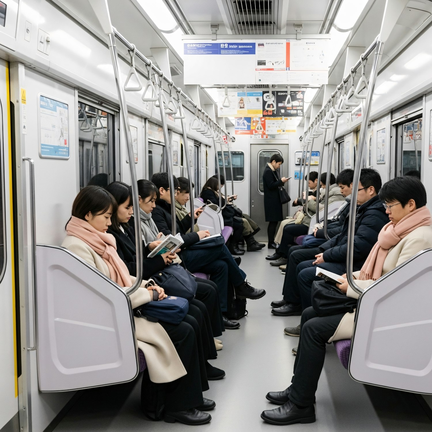 A quiet subway car with passengers seated, reading or using phones, dressed in winter attire, and surrounded by clean, modern interiors.