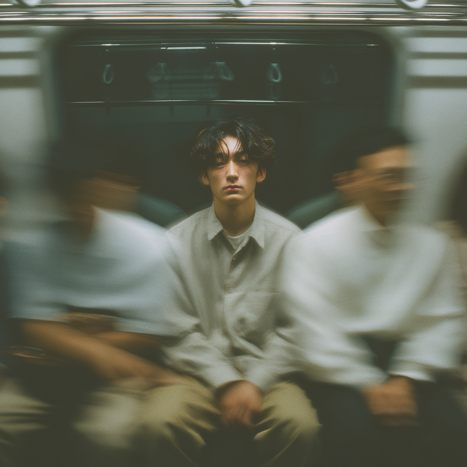A young person sits in a subway car, surrounded by blurred passengers, creating a striking contrast of stillness and motion.