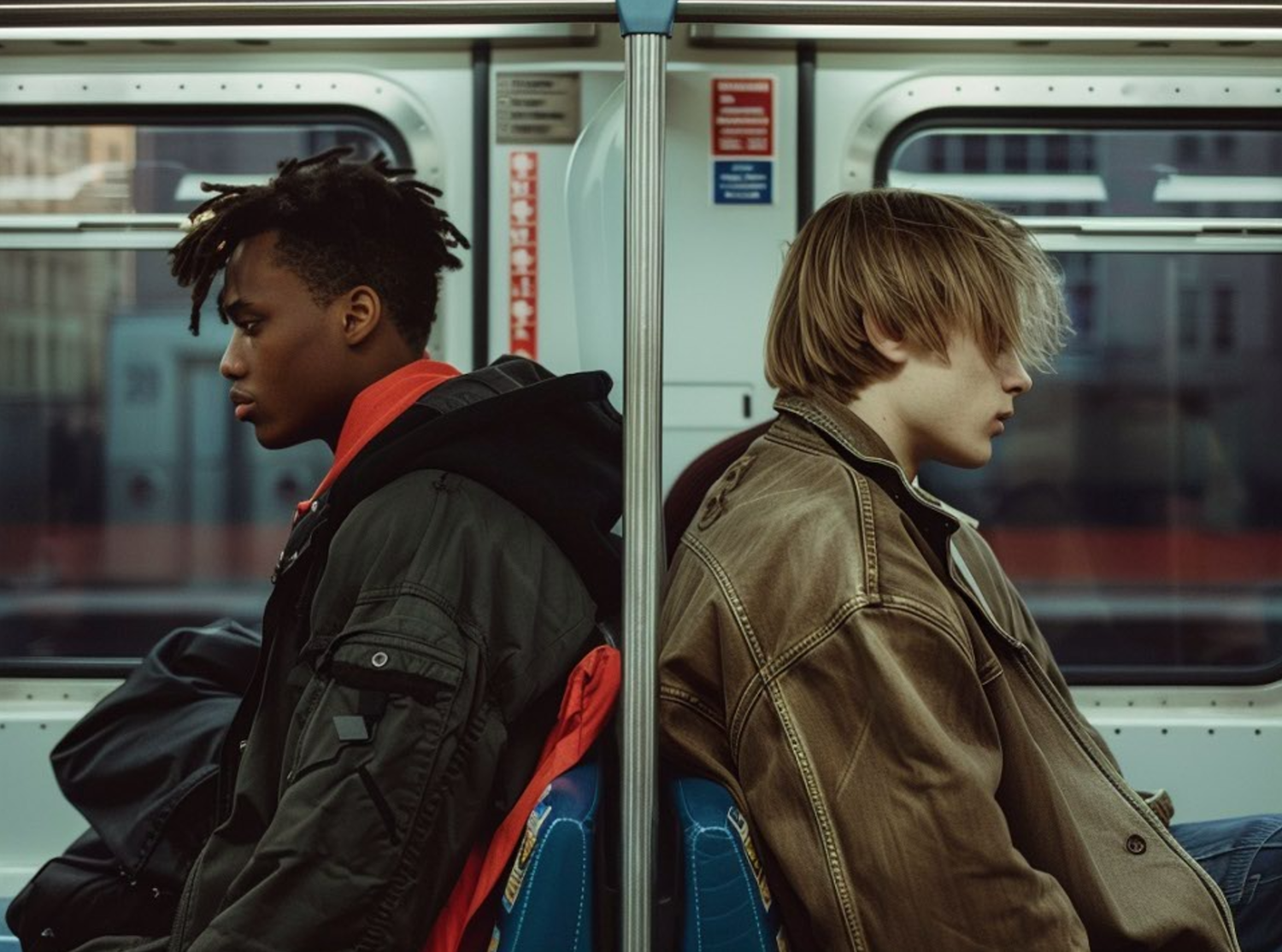 Two young men sit back-to-back on a subway, lost in thought. One wears a green jacket, the other a brown one, with a blurred cityscape outside.