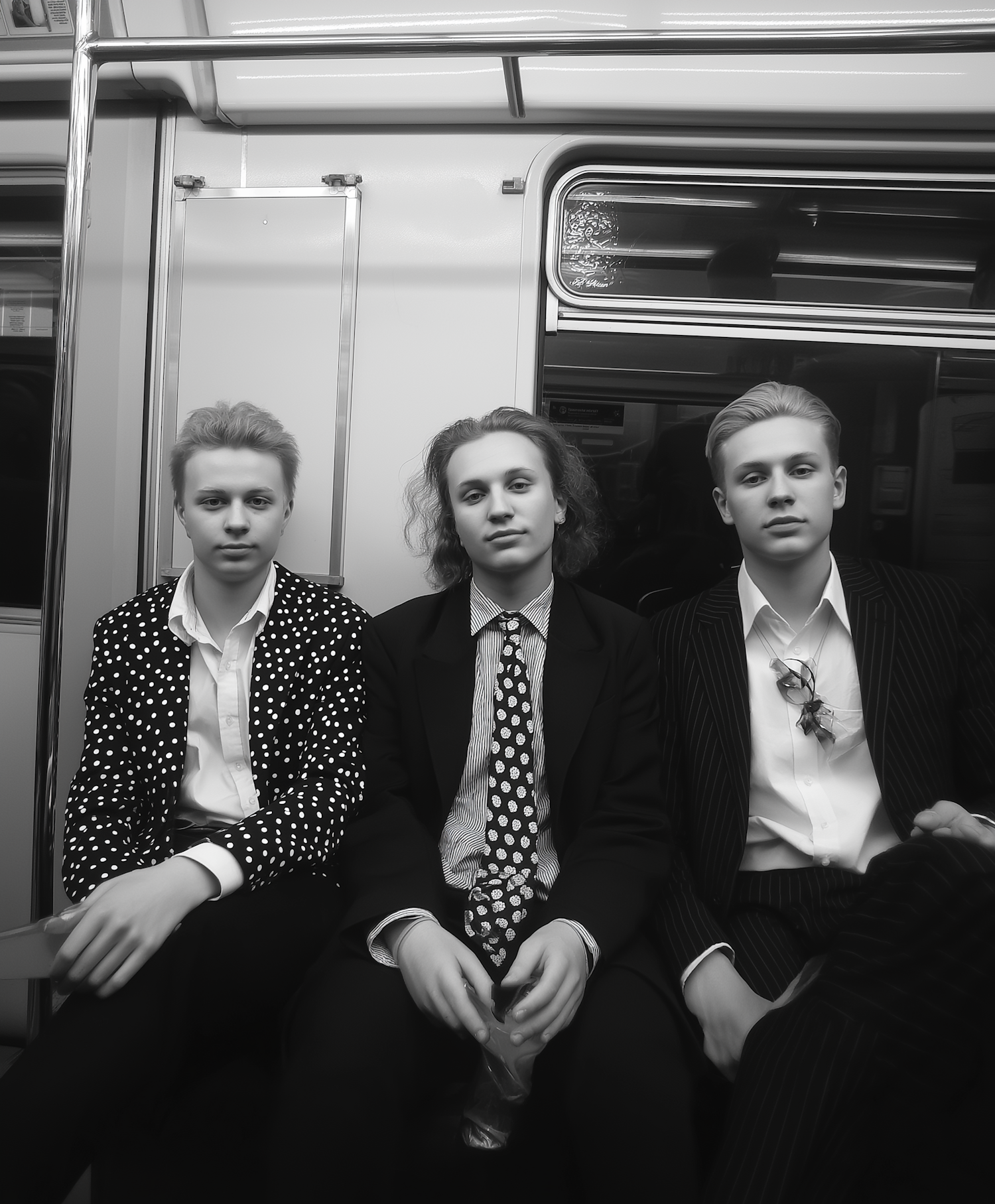 Three stylishly dressed individuals sit in a subway car, showcasing unique formal attire in a monochromatic setting.