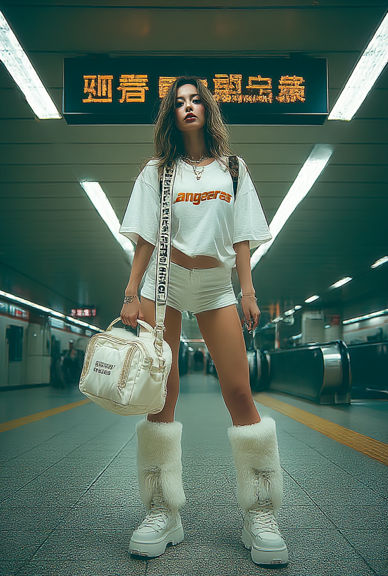 A stylish woman in a subway station wearing a white outfit and fur-trimmed boots, carrying a bag, with bright lighting and signage.