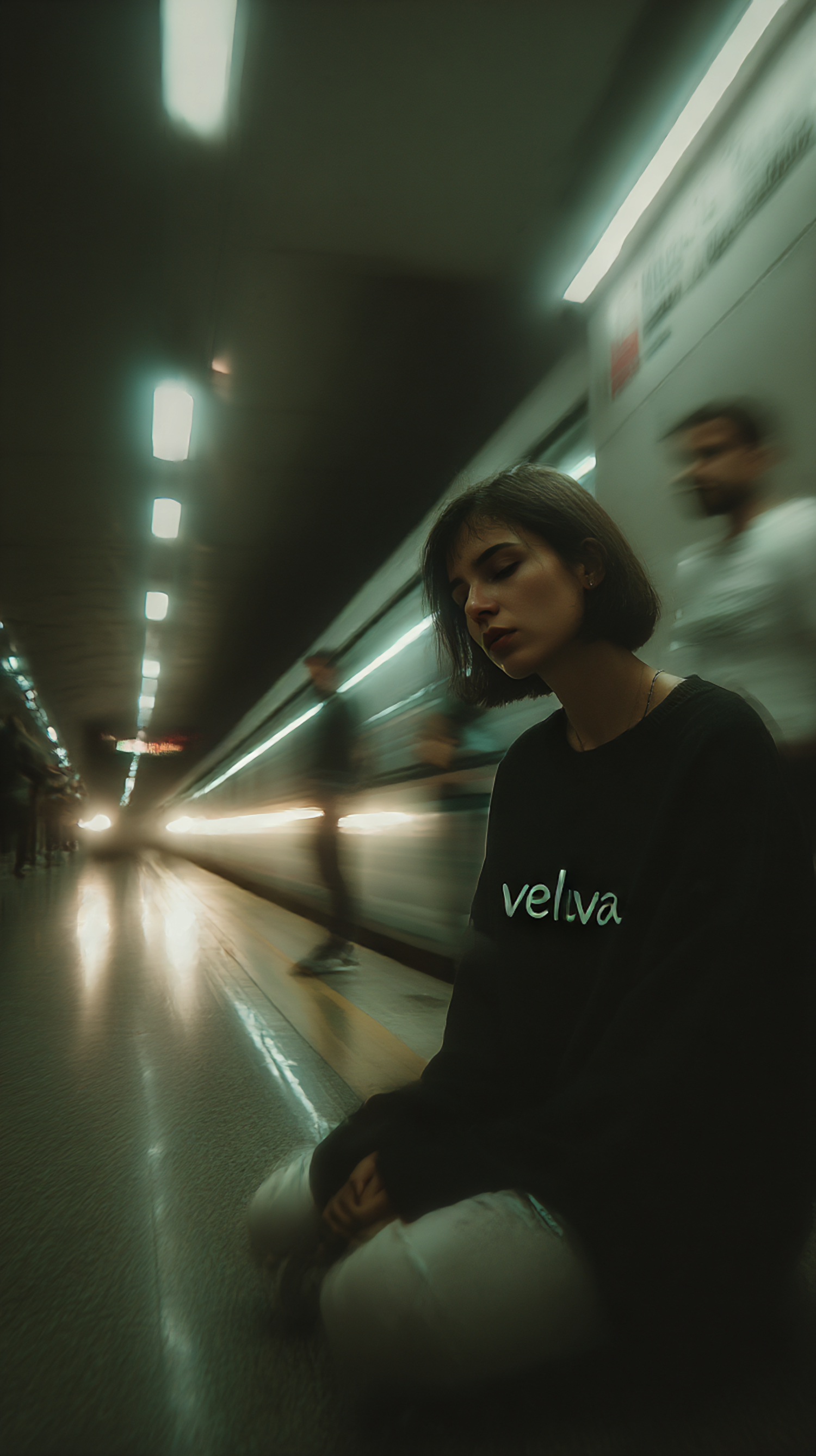 A young woman sits introspectively on a subway platform, with a moving train and dim lighting creating a moody urban scene.