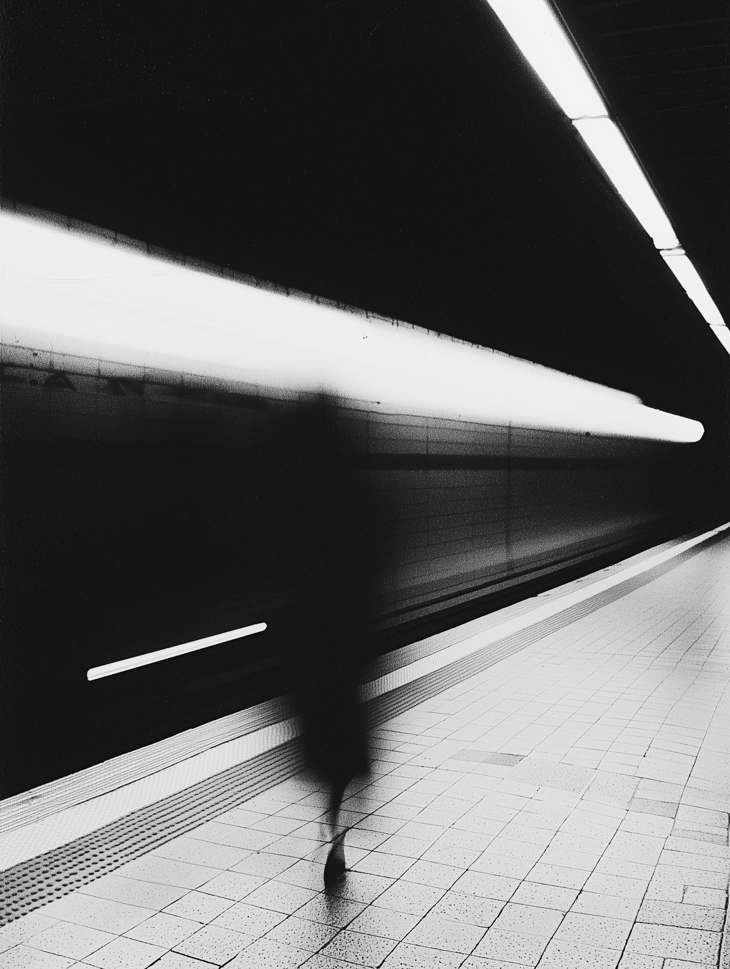 Black and white image of a blurred figure walking in a subway station, creating a sense of motion and mystery.
