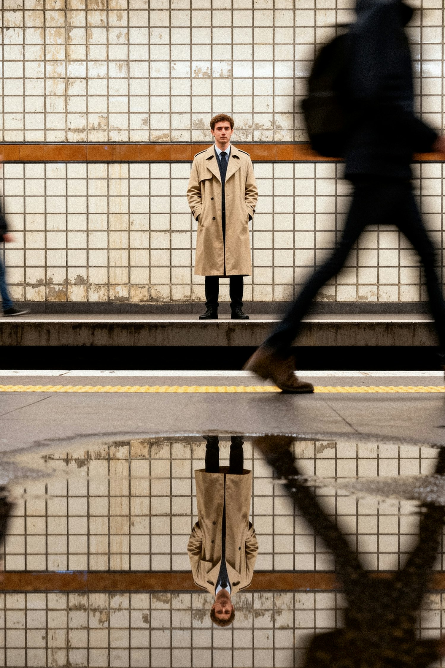 A man in a beige trench coat stands on a subway platform, reflected in a puddle, with a blurred figure walking in the foreground.
