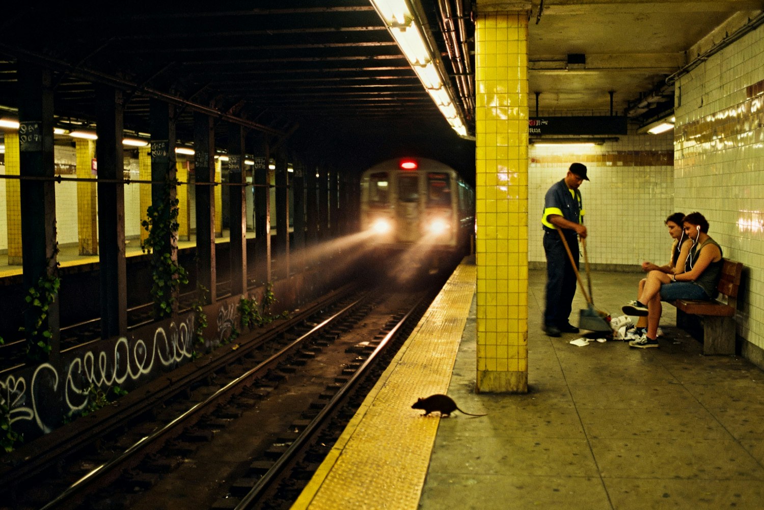 A realistic 2000s-era snapshot captured from track level, Canal Street station, Manhattan, July 2004, late night. Only a few riders remain — a couple sharing earbuds, a man in a janitor’s uniform sweeping litter into a dustpan. The tiled columns reflect dim yellow light; graffiti curls around the lower walls like vines. Far down the tunnel, the headlights of an approaching train bloom into brightness. A rat darts across the rail and vanishes. Shot on Kodak Portra 400 film with a Pentax K1000, f/1.8, 1/30s, handheld. Noticeable film grain and motion ghosting near the sweeping figure. A moment humming with loneliness and the steady rhythm of the city’s underground heart.