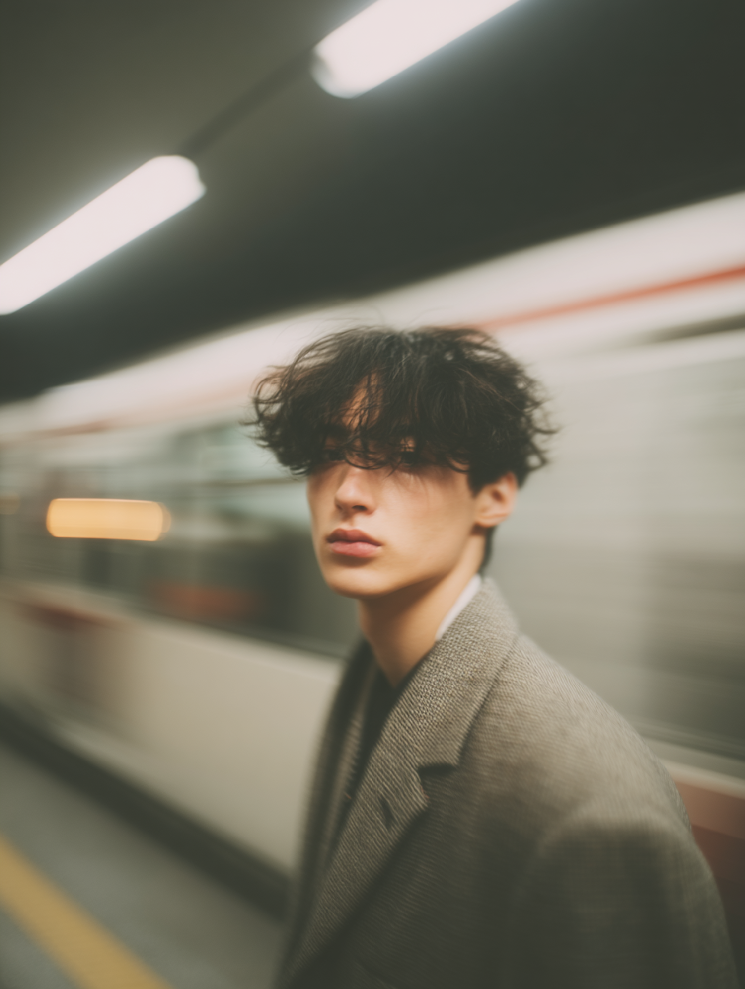 A stylish individual in a gray coat stands in a subway station with a moving train in the background, creating a dynamic urban vibe.