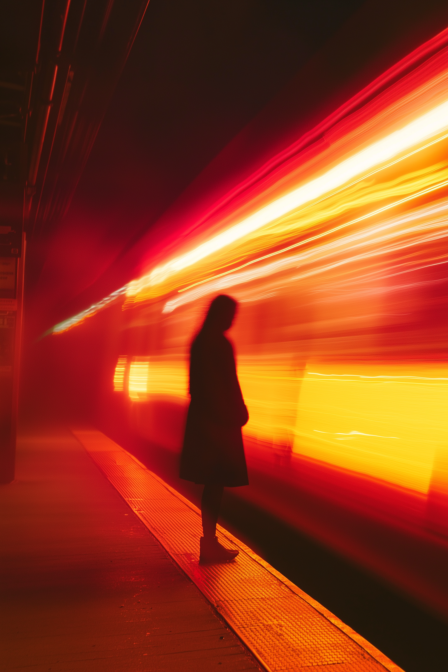 A silhouette on a subway platform with vibrant red and yellow light trails from a passing train, creating a dynamic urban scene.