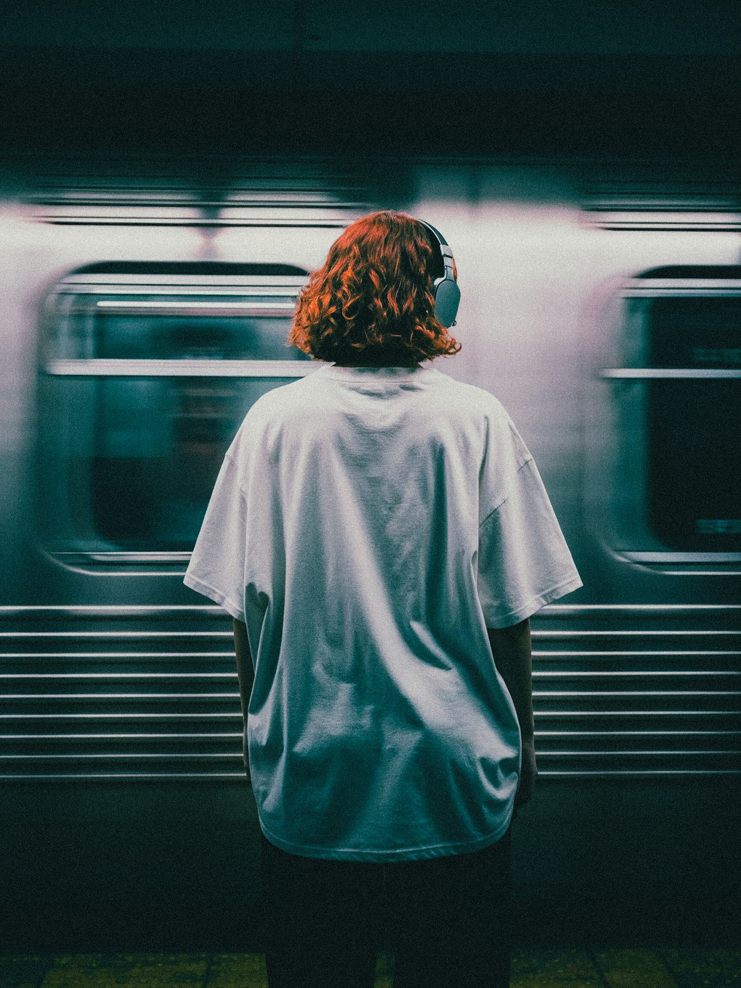 A person with red hair and headphones stands in front of a moving subway train, creating a dynamic and moody urban scene.