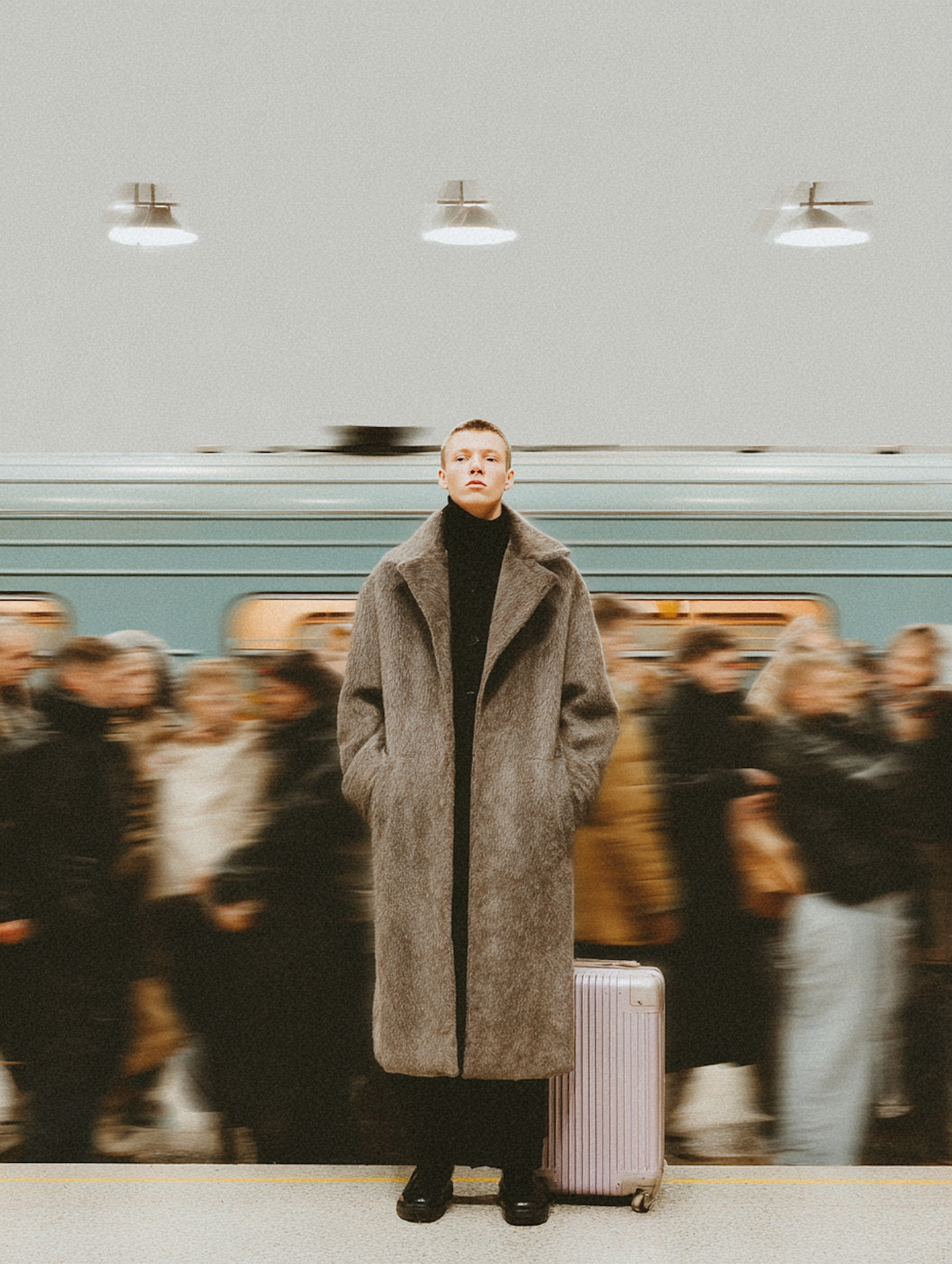 A person in a gray coat stands still in a busy subway station, with a silver suitcase beside them and a moving train in the background.