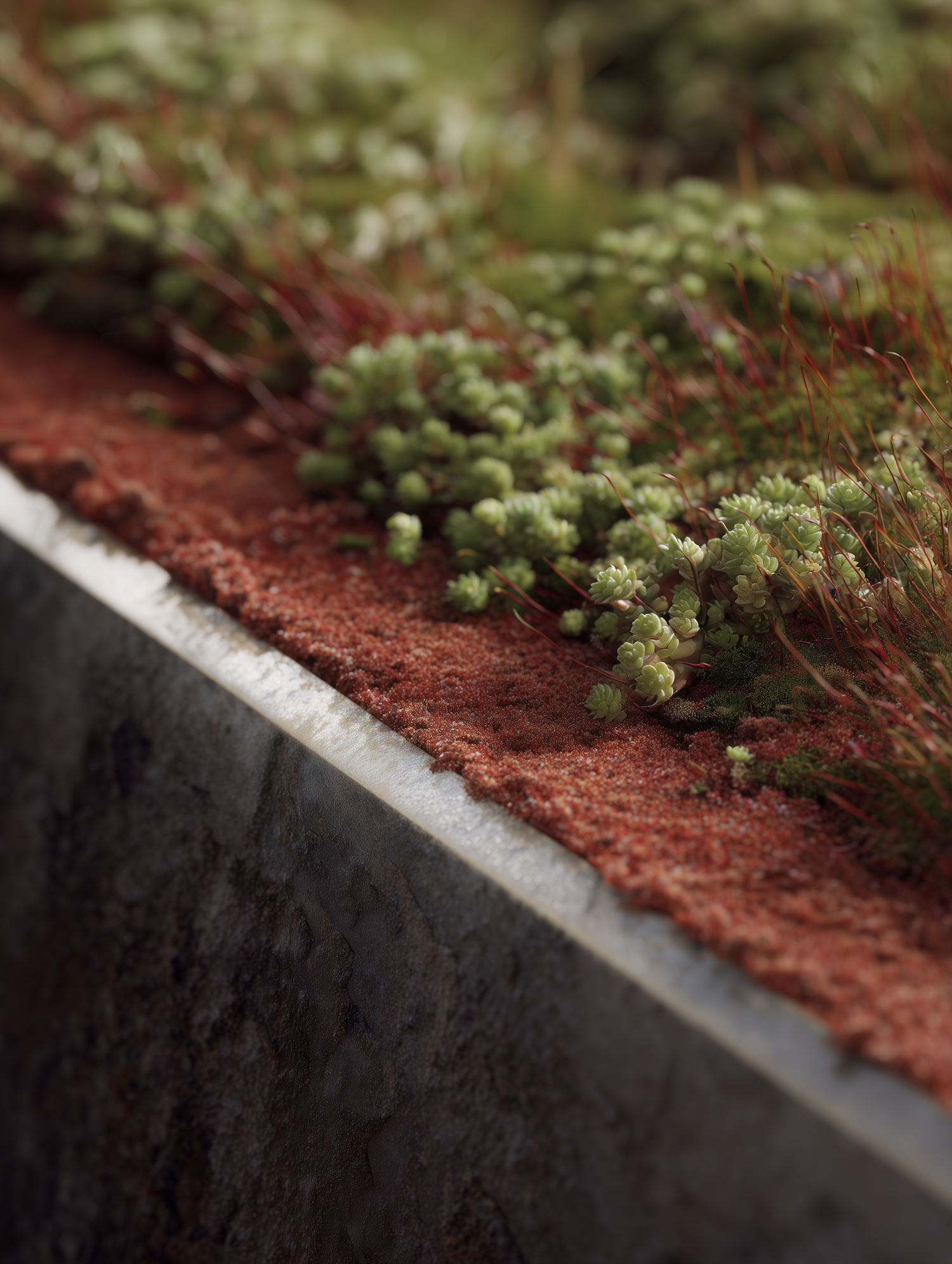 Close-up of a garden bed with green succulents and red moss on a stone edge, showcasing vibrant colors and natural textures.