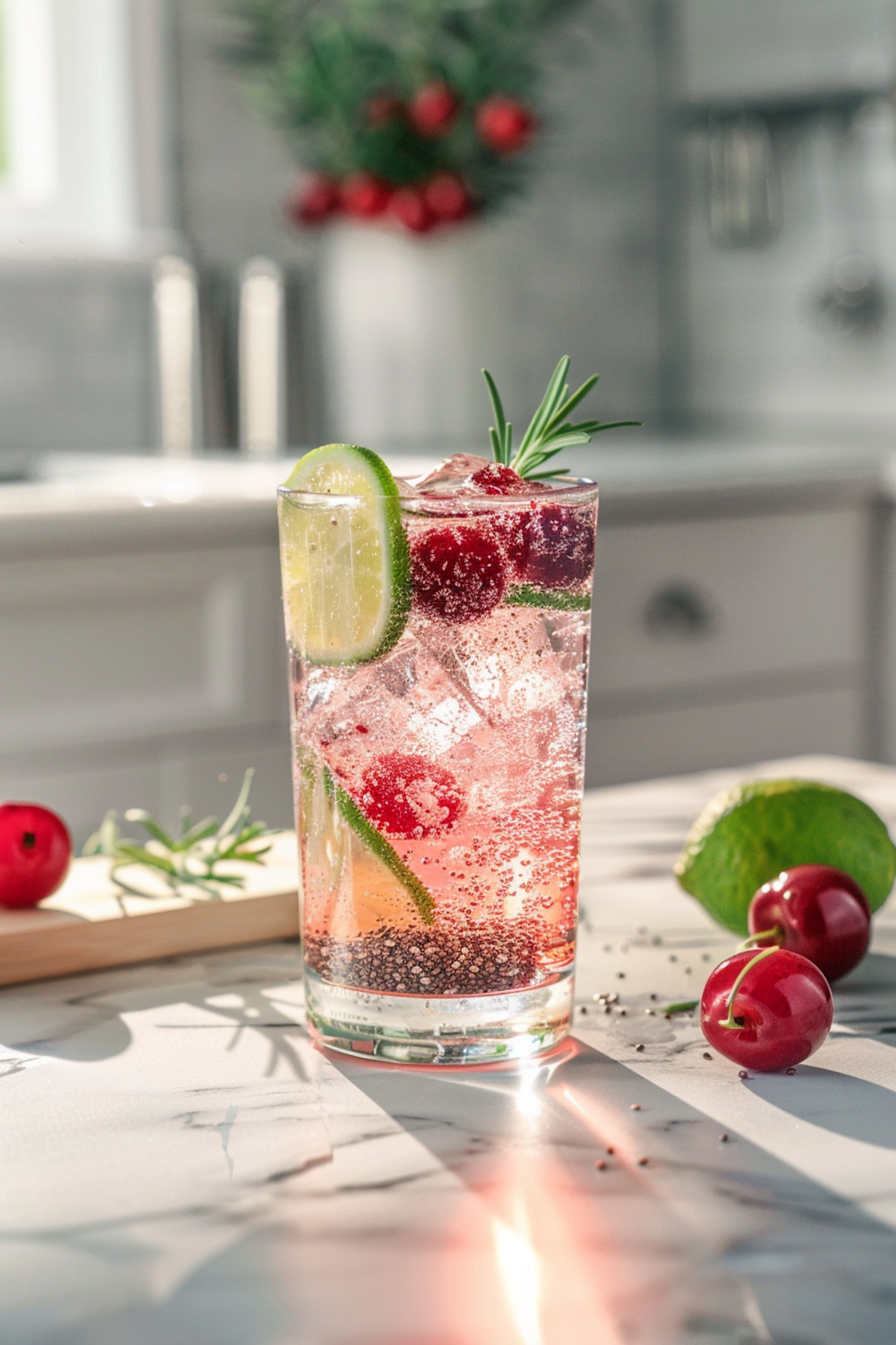 Refreshing fizzy drink with cherries, lime, and rosemary on a sunlit marble counter.