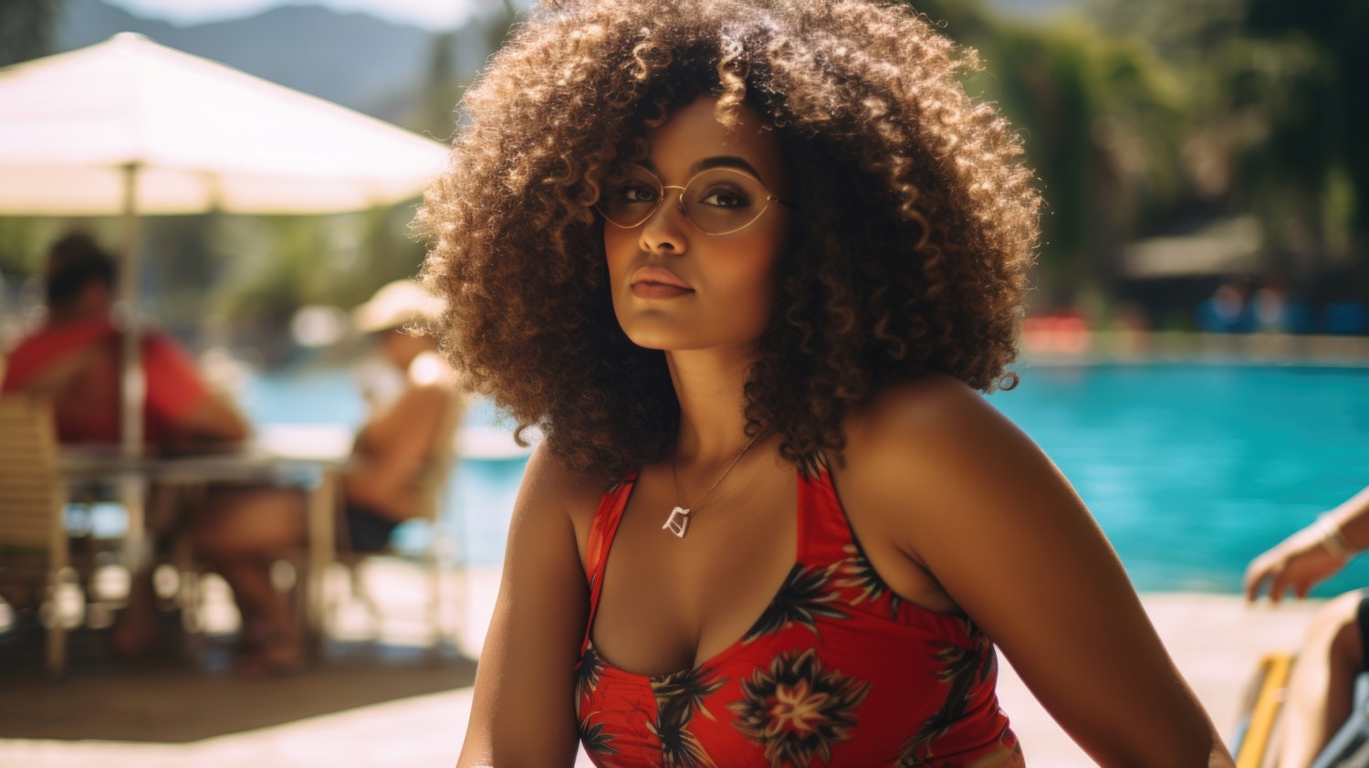 Woman with curly hair and glasses in a red floral swimsuit by a poolside, exuding confidence and style on a sunny day.
