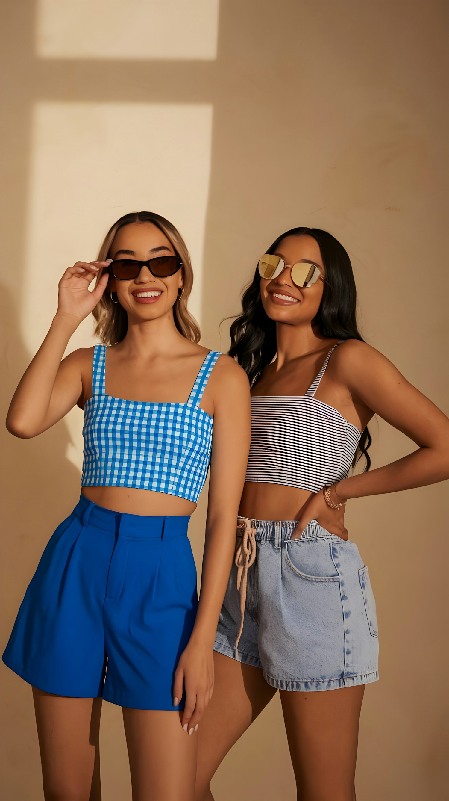 Two stylish women in crop tops and shorts, accessorized with sunglasses, posing against a beige background in a summery vibe.