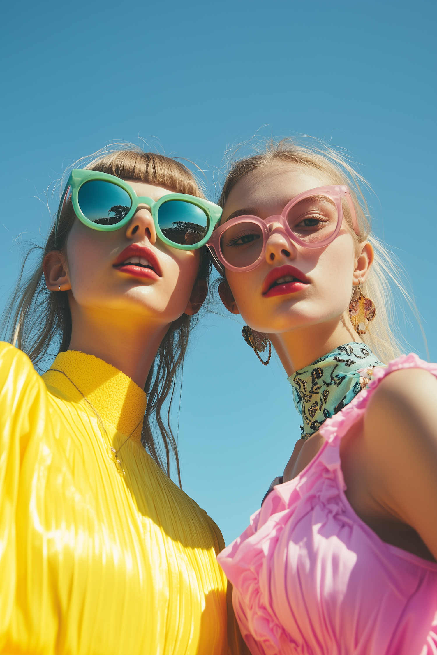 Two stylish women in bold sunglasses and colorful outfits pose under a bright blue sky, radiating summer vibes and playful confidence.