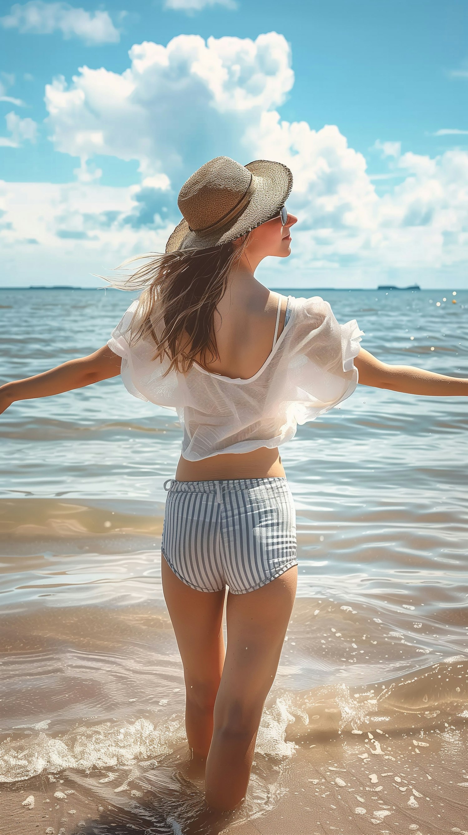 Woman in a straw hat and sheer top enjoys a sunny day at the beach, standing in shallow water with arms outstretched.