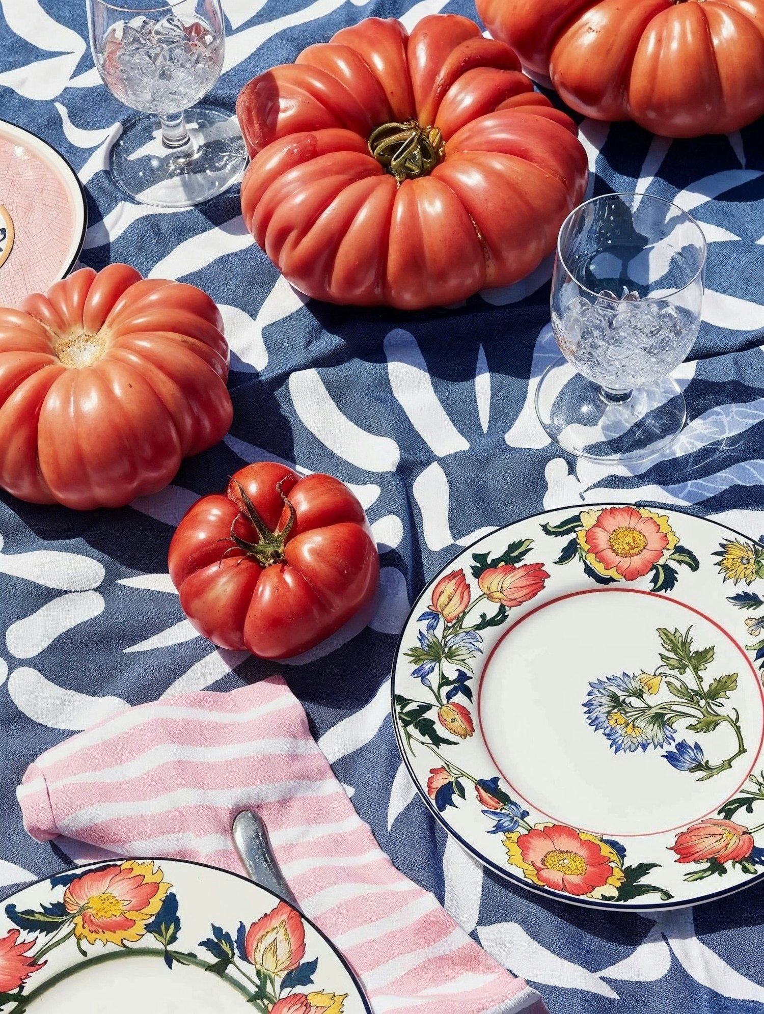 Bright table setting with heirloom tomatoes, floral plates, striped napkin, and blue patterned tablecloth for a summery vibe.