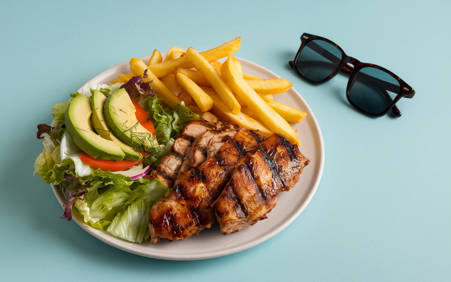 Grilled chicken with fries and salad on a plate, accompanied by stylish sunglasses on a light blue background.