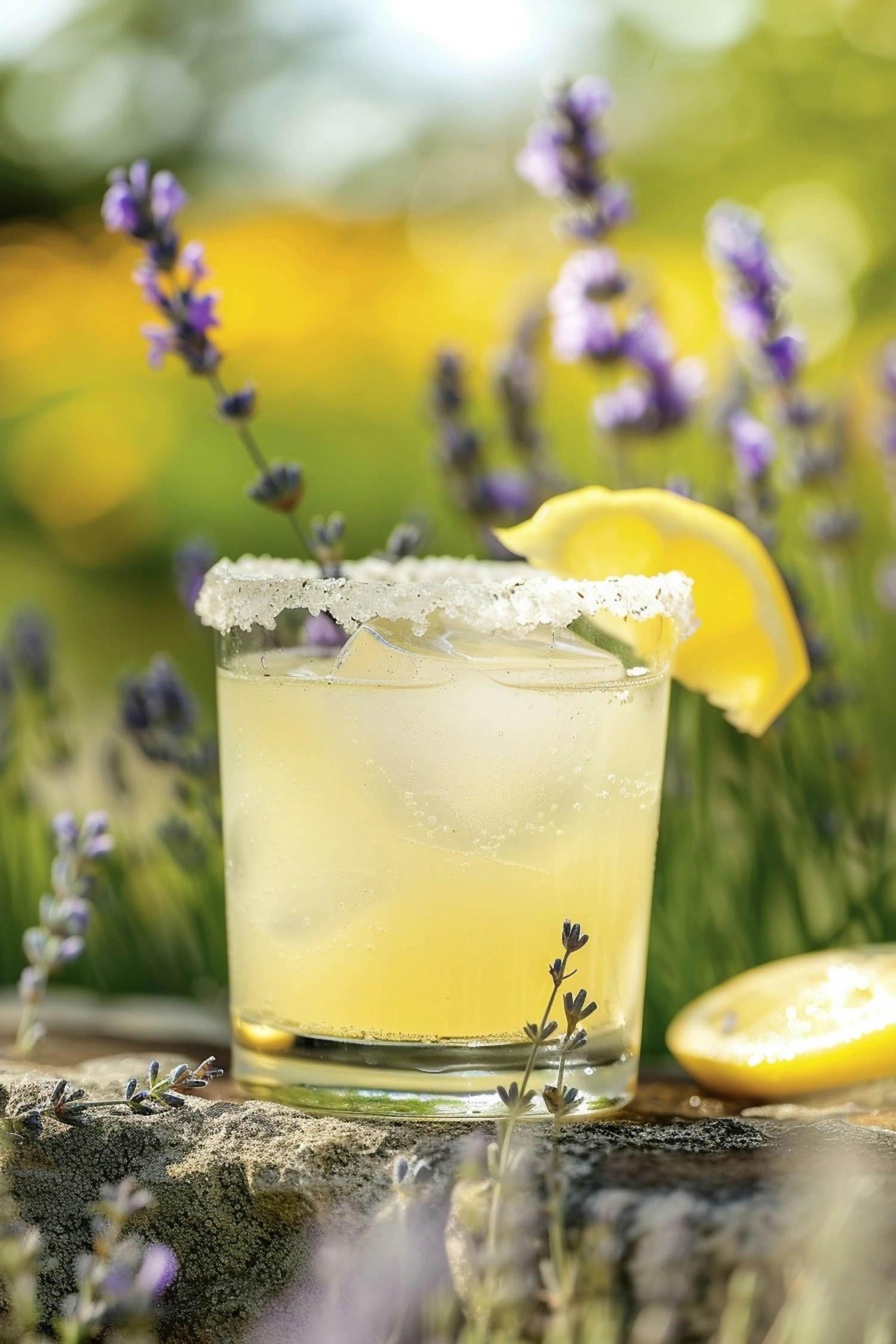 Refreshing lemonade with ice and lemon slice, surrounded by lavender in a sunny garden setting.