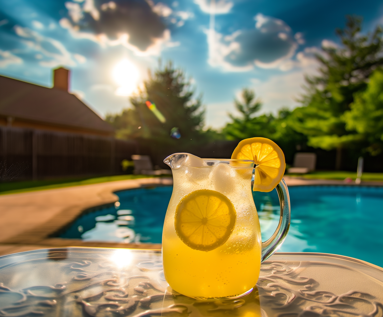 Refreshing lemonade pitcher by a poolside, with lemon slices and ice, under a sunny blue sky. Perfect summer relaxation scene.