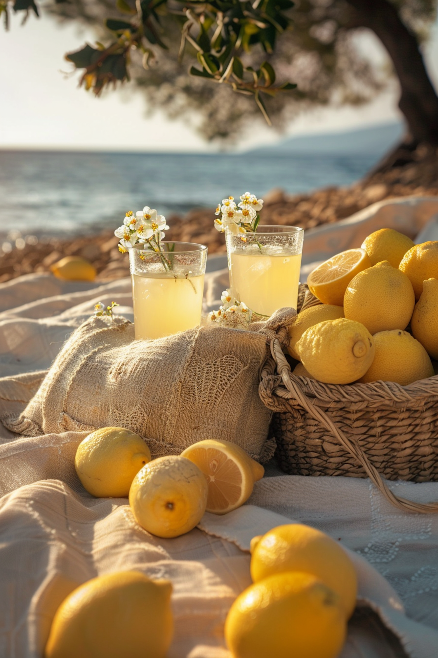 Rustic seaside picnic with fresh lemonade, a wicker basket of lemons, and warm golden light creating a serene summer vibe.