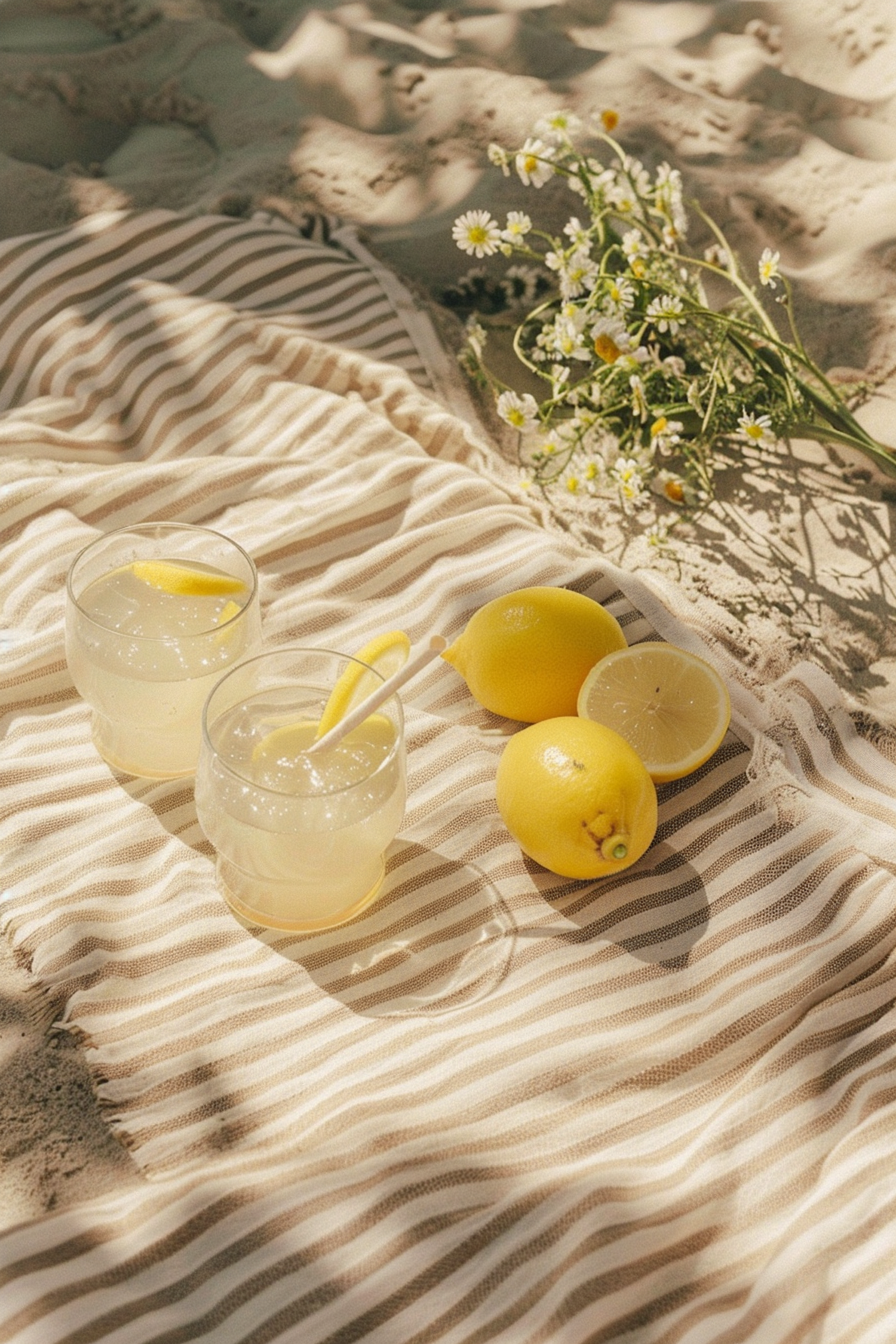Refreshing lemonade on a striped blanket with lemons and daisies on a sunny beach setting.